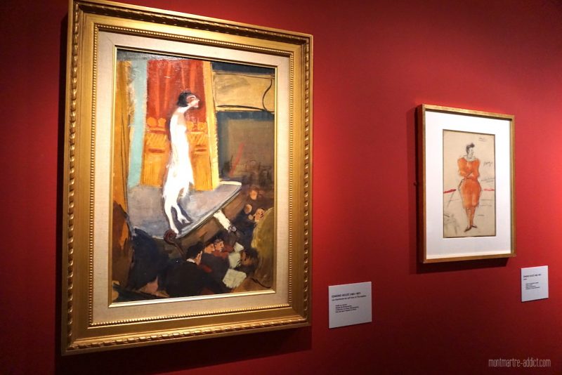Direction les cirques et lieux de spectacles, nombreux à cette époque autour de la Butte, et malheureusement aujourd’hui pour beaucoup disparus. La plupart des artistes fréquentaient ces endroits de fête et d’amusement qui les ont beaucoup inspiré, parmi lesquels le très beau tableau d’Edmond Heuzé, La chanteuse au Caf’Conc à l’Européen, qui illustre l’affiche de l’exposition.