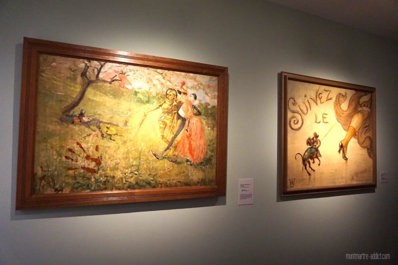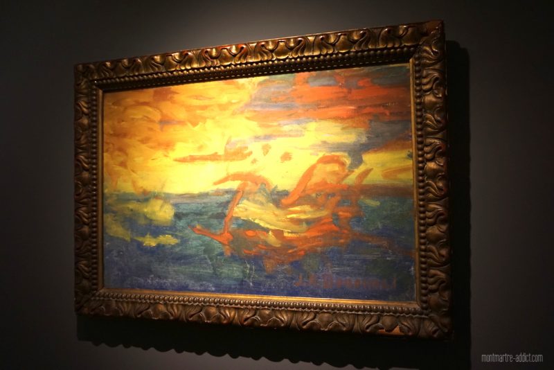 Eugène Delâtre et Edouard Lefèvre travaillèrent respectivement au 87 et au 102 de la rue Lepic (leurs ateliers se faisaient face), mais c’est dans la salle suivante que l’on peut admirer ce qui constitue le clou de l’exposition. En effet, c’est la première fois qu’est exposé le fameux Et le soleil s’endormit sur l’Adriatique, peint en 1901 devant le Lapin Agile par un certain Joachim Raphael Boronali. Si vous ne connaissez pas l’histoire, sachez que ce mystérieux peintre n’était autre qu’un âne prénommé Lolo, propriété du Père Frédé, patron du cabaret. Le 11 mars 1910, Roland Dorgelès et ses amis Warnod, Genty et Girieud eurent l’idée de monter un canular dans le but de démontrer que n’importe quelle oeuvre pouvait être admise au Salon des Indépendants. Ils fixèrent donc un pinceau sur la queue de l’âne, qui barbouilla ce qui devint le fameux Et le soleil s’endormit sur l’Adriatique, exposé au Salon des Indépendants, et qui y trouva même acquéreur, avant que Dorgelès ne révèle la supercherie. En 1953, le tableau fut racheté par le collectionneur d’art Paul Bédu, et est depuis exposé à Milly-la-Forêt, le sieur Bédu ayant spécifié dans son testament que la toile ne devrait jamais quitter Milly. C’est donc à titre tout à fait exceptionnel que nous pouvons aujourd’hui l’admirer au Musée de Montmartre, et rien que pour cette raison, l’exposition mérite le détour !