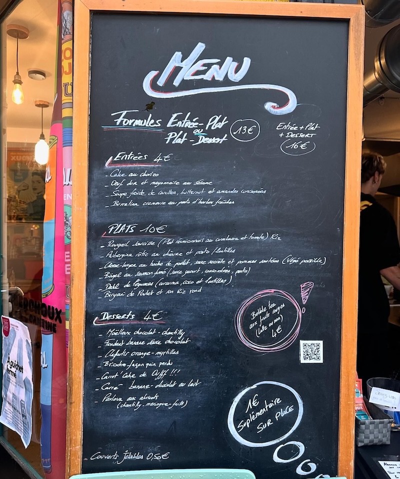 Aujourd’hui, Berchoux est devenu une vraie cantine de quartier, où l’on peut continuer de commander des plats à emporter, mais où l’on peut aussi déjeuner ou diner sur place dans une ambiance familiale et décontractée. Le menu change quotidiennement, Julie collaborant avec les maraîchers locaux à qui elle rachète leur stock d’invendus : “L’idée, c’est de faire ce qu’on peut avec ce qu’on a”. Cette approche lui permet non seulement de proposer des plats innovants mais aussi de réduire le gaspillage alimentaire. La carte met l’accent sur une cuisine flexitarienne, avec de vrais plats végétariens pensés avec soin. Ainsi, pour seulement 10€, les clients peuvent déguster un vrai plat cuisiné avec le même niveau d’exigence que dans un restaurant gastronomique : “J’ai envie qu’on se dise “Oui c’est simple, mais ce petit goût en plus, je ne l’attendais pas”. Et les gens sont souvent étonnés par ce qu’ils mangent ici.”
