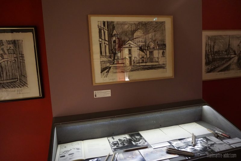 Les rues de Montmartre, ils les arpente durant dix ans pour se rendre à l’atelier de gravure Lacourière et Frélaut, « temple de la gravure » situé rue Foyatier, et il réalise plusieurs toiles du quartier que l’on peut actuellement admirer au Musée, comme La Maison Rose (1989), La Place Pigalle (1989), Le Moulin De La Galette (1998) ou encore l’extraordinaire Sacré-Cœur de Montmartre, gravure à la pointe sèche réalisée en 1993. Mais Buffet n’aura pas attendu de revenir à Montmartre pour le peindre, comme le montre cette autre gravure datant elle de 1968, L’Église Saint-Pierre de Montmartre.