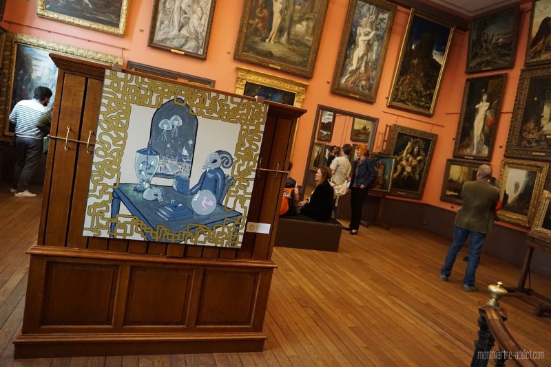 Il faut dire que si effectivement, on ne s’attend pas à y voir de l’art contemporain, l’œuvre de Codex Urbanus s’inscrit parfaitement dans l’univers de Gustave Moreau, très inspiré lui aussi par la mythologie et les personnages chimériques. Le lieu en soi est déjà complètement incroyable, puisqu’on visite la maison du peintre, ainsi que son atelier, dans lequel trône sans doute l’un des plus escaliers de tout Paris. Les travaux de Codex sont exposés parmi les œuvres de Moreau, et dans certaines salles, on vous inviterait presque à jouer au jeu du « où est Charlie ? » pour retrouver Codex…
