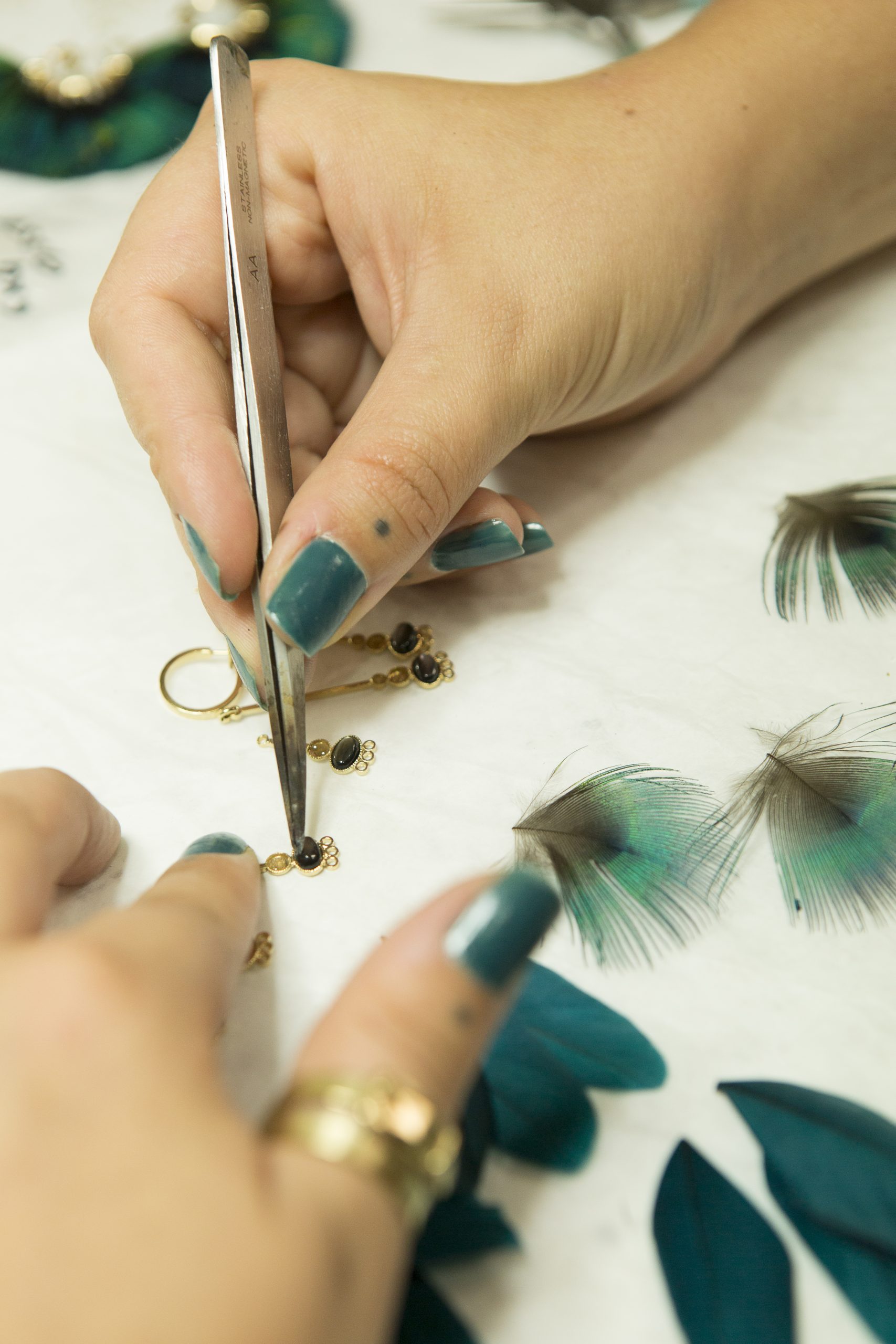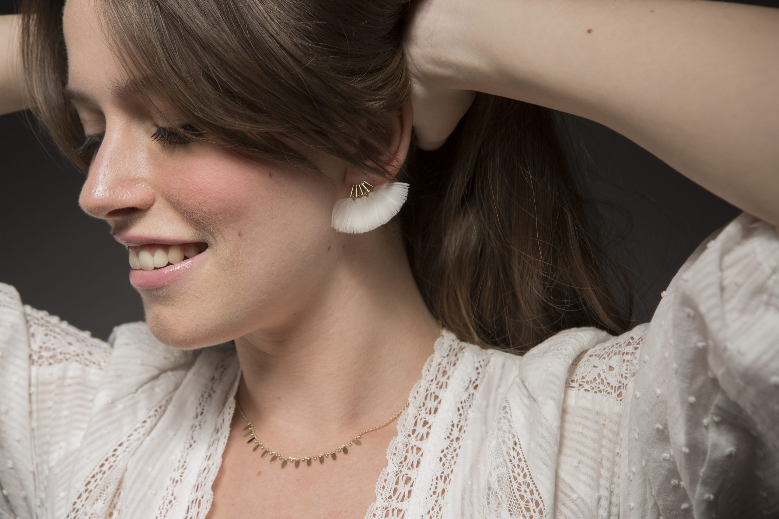 Il faut dire que ses créations sont sublimes, véritables bijoux de peau tout en finesse et légèreté. La créatrice n’aime pas les choses rigides, elle préfère les bijoux qui bougent, et qui savent se montrer discrets tout en étant bien présents. C’est pour cette raison qu’elle ne travaille que les belles matières, plaqué or, vermeil, or, pierres précieuses et semi-précieuses en perles fines, et qu’elle adore les plumes naturelles, découpées et peintes à la main. Le résultat ? Des collections raffinées et élégantes renouvelées deux fois dans l’année, et qui séduisent un public de plus en plus large au fil des années.