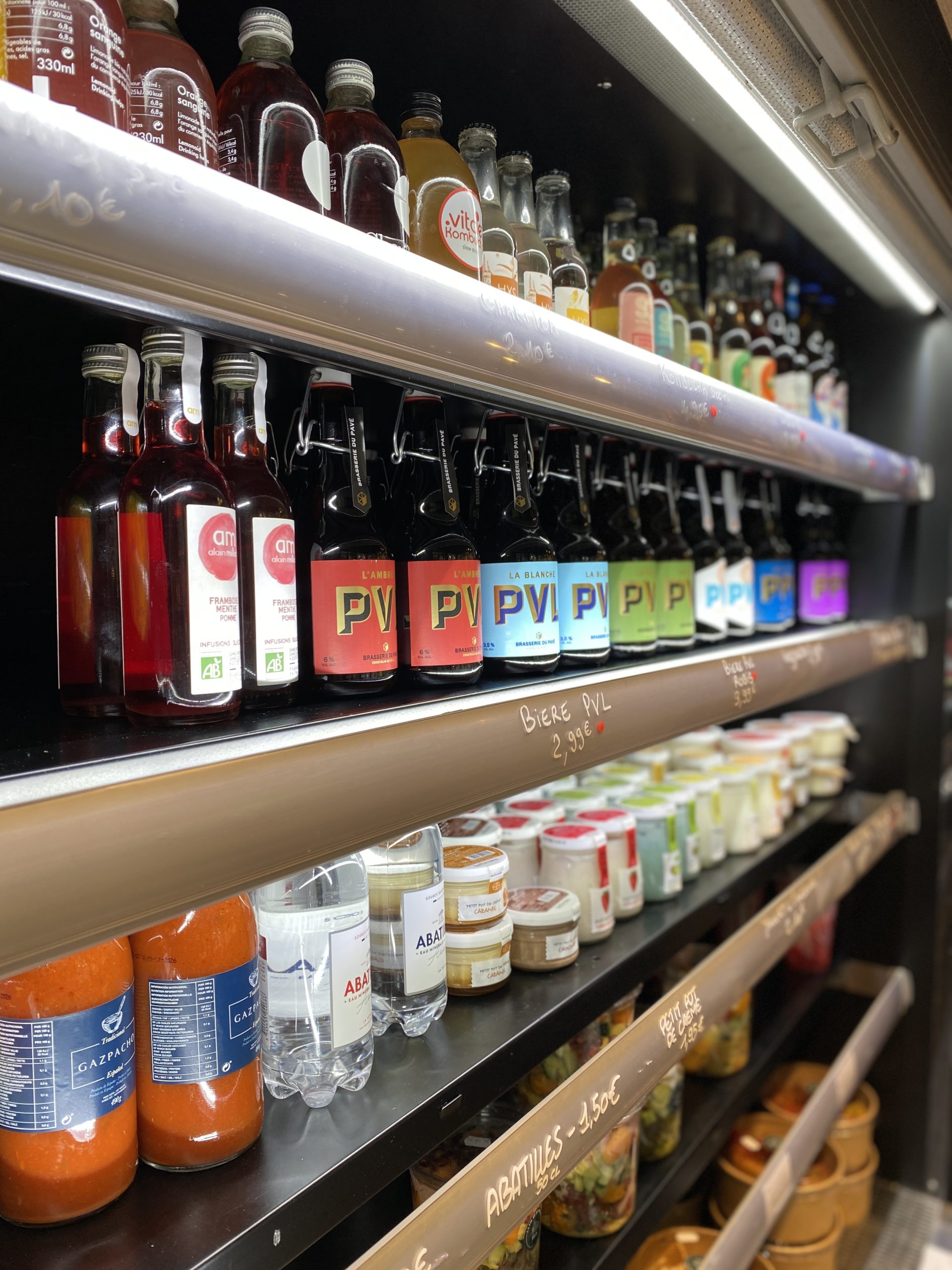 Après avoir fait le plein de vitamines, on se dirige vers les rayonnages de vrac où une multitude de bocaux consignés attendent sagement d’être emportés : fruits secs, légumineux et mélanges singuliers pour l’apéro, il n’y a qu’à lever le bras pour réduire vos déchets. Pour compléter votre panier, vous ne trouverez pas plus d’une ou deux références à chaque fois. Le rayon frais plutôt complet trie sur le volet fromages du terroir, viandes, poissons, charcuterie fine, lait, beurre et yaourts. La cave elle aussi simplifie les choses : une seule bouteille de blanc, de rouge et de rosé vous éviteront de trop longues tergiversations.