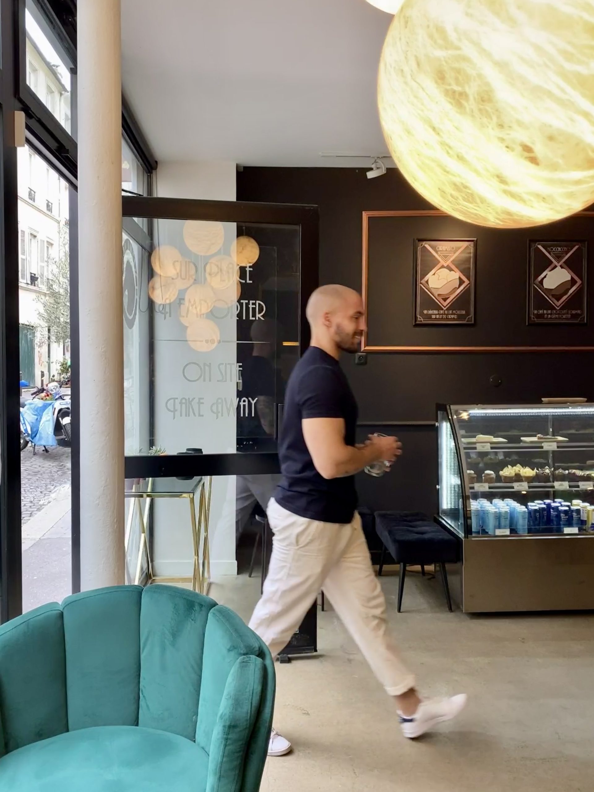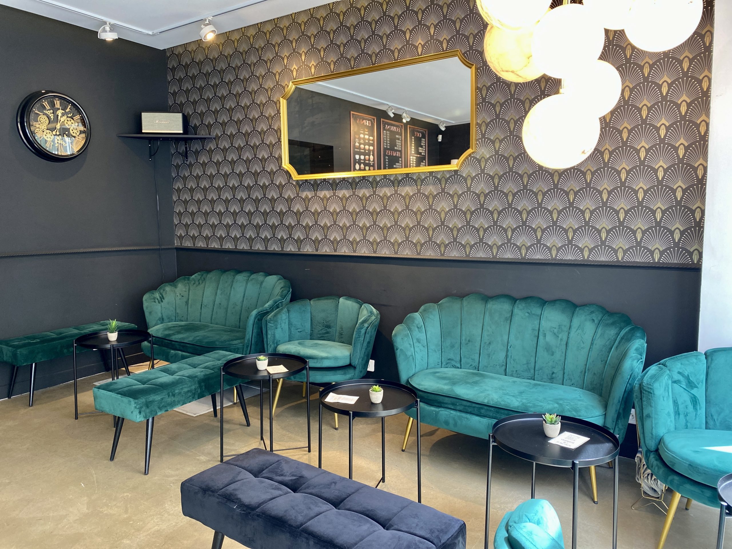Quelle que soit l’heure de la journée, on pousse la porte avec plaisir, et on est accueilli avec le sourire ! On se laisse bercer par le sifflement de la machine en prenant le temps de lire, de checker ses e-mails ou de se retrouver entre amis. Le cadre a été pensé pour se la jouer cosy et rétro : papier-peint Art Déco aux murs, canapés de velours vert et playlist qui enchaîne des titres plus jazzy les uns que les autres en font une véritable échappatoire à la surchauffe « métro-boulot-dodo », qualifiée de « third place » par le maître des lieux.