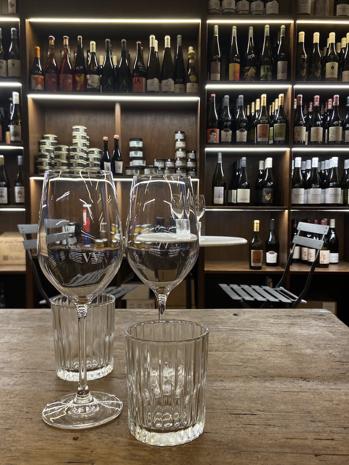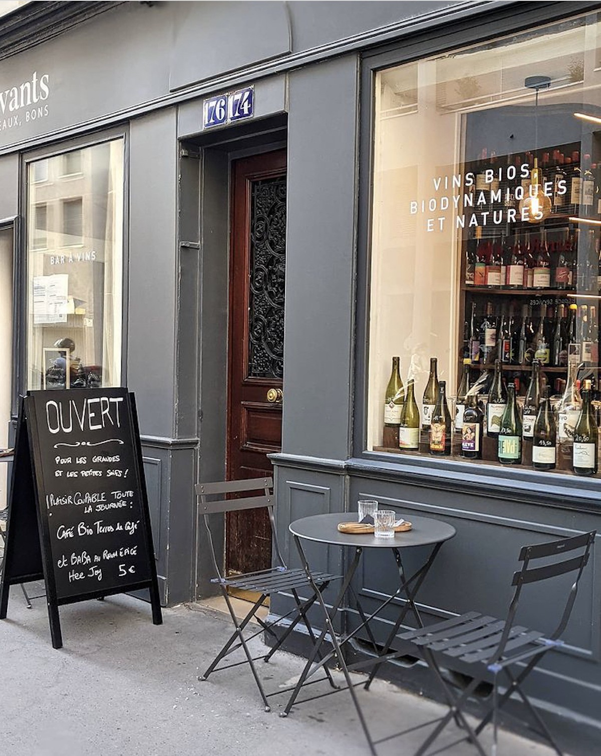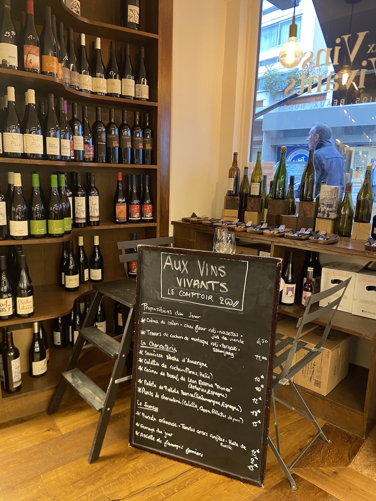 Tandis que Marie gère à la fois le lieu et la cuisine, c’est Megan qui depuis quelques mois vous accueille en boutique. Cette canadienne, diplômée du WSET (Wine & Spirit Education Trust) de Vancouver, a fait ses armes au Plaza Athénée puis au Barav avant de rejoindre l’aventure Aux Vins Vivants. Autant dire qu’elle en connaît un rayon, et qu’elle saura vous conseiller parmi toutes les pépites de la cave. Ce qu’on apprécie particulièrement ici, c’est la grande variété de styles de vins proposés, avec un gros cœur de gamme entre 10 et 15€ ; des prix très corrects pour des vins nature ou bio. Mais surtout, on peut acheter du vin jusqu’à presque minuit, et ça c’est juste génial quand on improvise une fin de soirée entre copains ou qu’on très en retard à un dîner, sachant que grâce au chiller, n’importe quelle bouteille peut être rafraichie en quelques instants ; parfait pour les soifs de dernière minute !