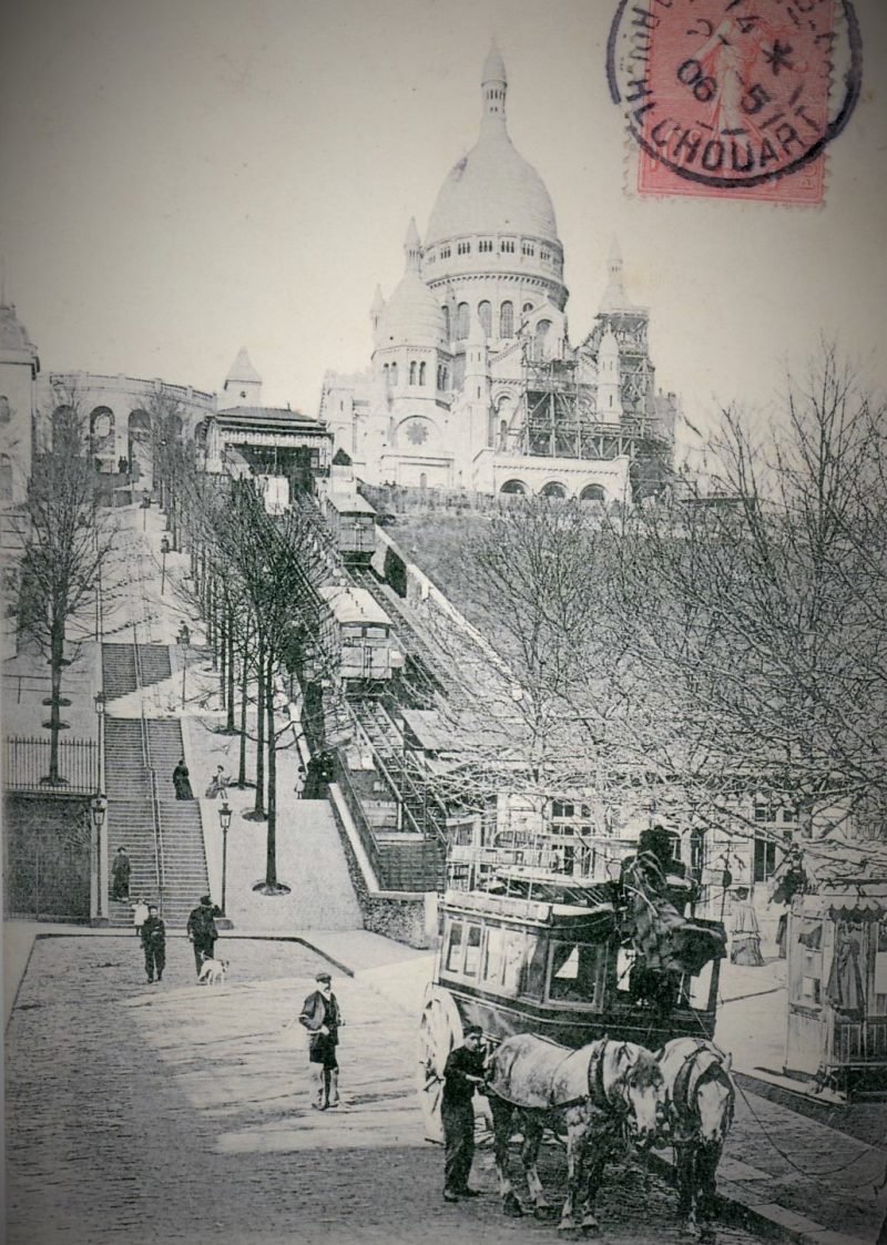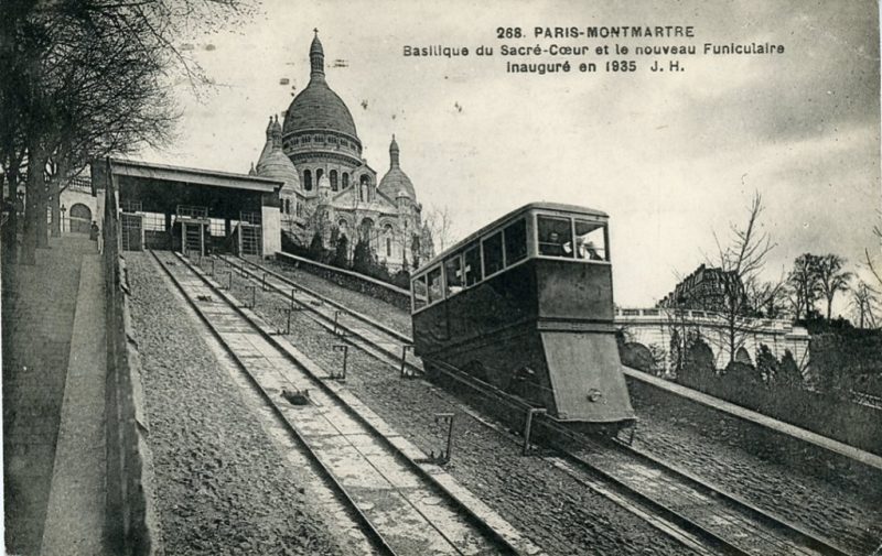 C’est en 1891 que le Conseil de Paris décide de la construction d’un funiculaire afin d’acheminer les pèlerins vers la Basilique du Sacré Cœur. Inauguré en juillet 1900, le premier funiculaire fonctionne alors grâce à un système de contrepoids à eau, chacune des cabines disposant dans son plancher d’une cuve étanche remplie en station haute : le poids cumulé des voyageurs et de la cuve permet de faire descendre la cabine par gravité, et de faire remonter l’autre alors en station basse. A l’époque, un liftier pilotait la cabine, mais autant dire que le système de freinage n’était pas des plus précis, voire dangereux…