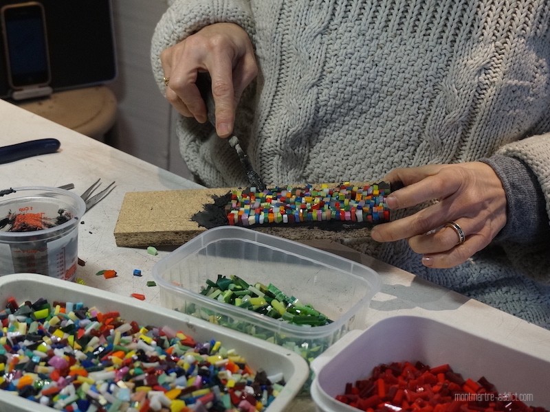 Si le numéro 45 reste incontestablement l’une des plus jolies devantures de la rue Lepic, l’adresse abrite surtout le très bel atelier de mosaïques de Véronique ; un lieu de création où elle expose son travail et où elle initie les amateurs à l’art de la mosaïque, qui fête cette année ses 10 ans !