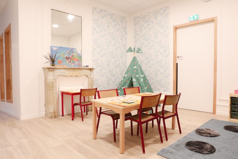 Les enfants sont accueillis dans un espace lumineux et chaleureux, décoré comme une maison (on veut le même papier-peint chez nous !), où même les cheminées ont été conservées. D’ailleurs, la méthode Montessori ne parle pas d’écoles mais de maisons d’enfants, qui sont souvent pensées comme un prolongement du foyer. Pas de cour de récréation certes, “mais nous avons la chance d’être juste en face du Square Joël Le Tac, à deux pas du Square Suzanne Buisson et tout près de La Turlure ! Et nous sortons beaucoup avec les enfants.”