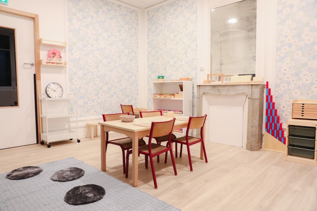 Les enfants sont accueillis dans un espace lumineux et chaleureux, décoré comme une maison (on veut le même papier-peint chez nous !), où même les cheminées ont été conservées. D’ailleurs, la méthode Montessori ne parle pas d’écoles mais de maisons d’enfants, qui sont souvent pensées comme un prolongement du foyer. Pas de cour de récréation certes, “mais nous avons la chance d’être juste en face du Square Joël Le Tac, à deux pas du Square Suzanne Buisson et tout près de La Turlure ! Et nous sortons beaucoup avec les enfants.”