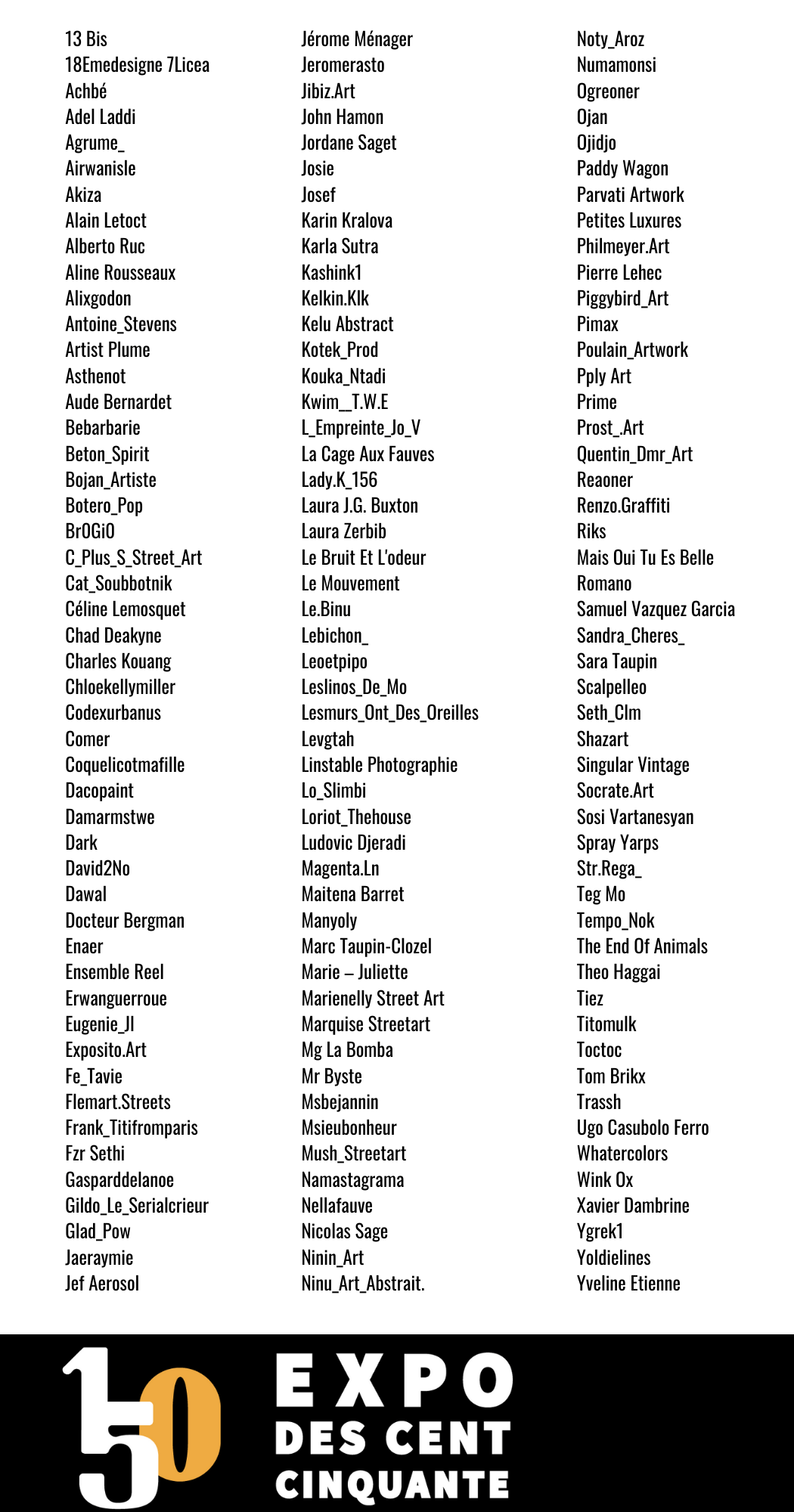 L’exposition d’art contemporain intitulée « Expo des 150 » permettra de présenter l’effervescence artistique du moment et de mettre en lumière la pluralité d’artistes actuels, de sujets et de techniques dans la création d’aujourd’hui. Cette exposition, exceptionnelle, se veut à l’image du Salon des Refusés. Pendant toute la durée de l’événement, les murs seront recouverts d’œuvres d’artistes contemporains de la nouvelle scène artistique parisienne.