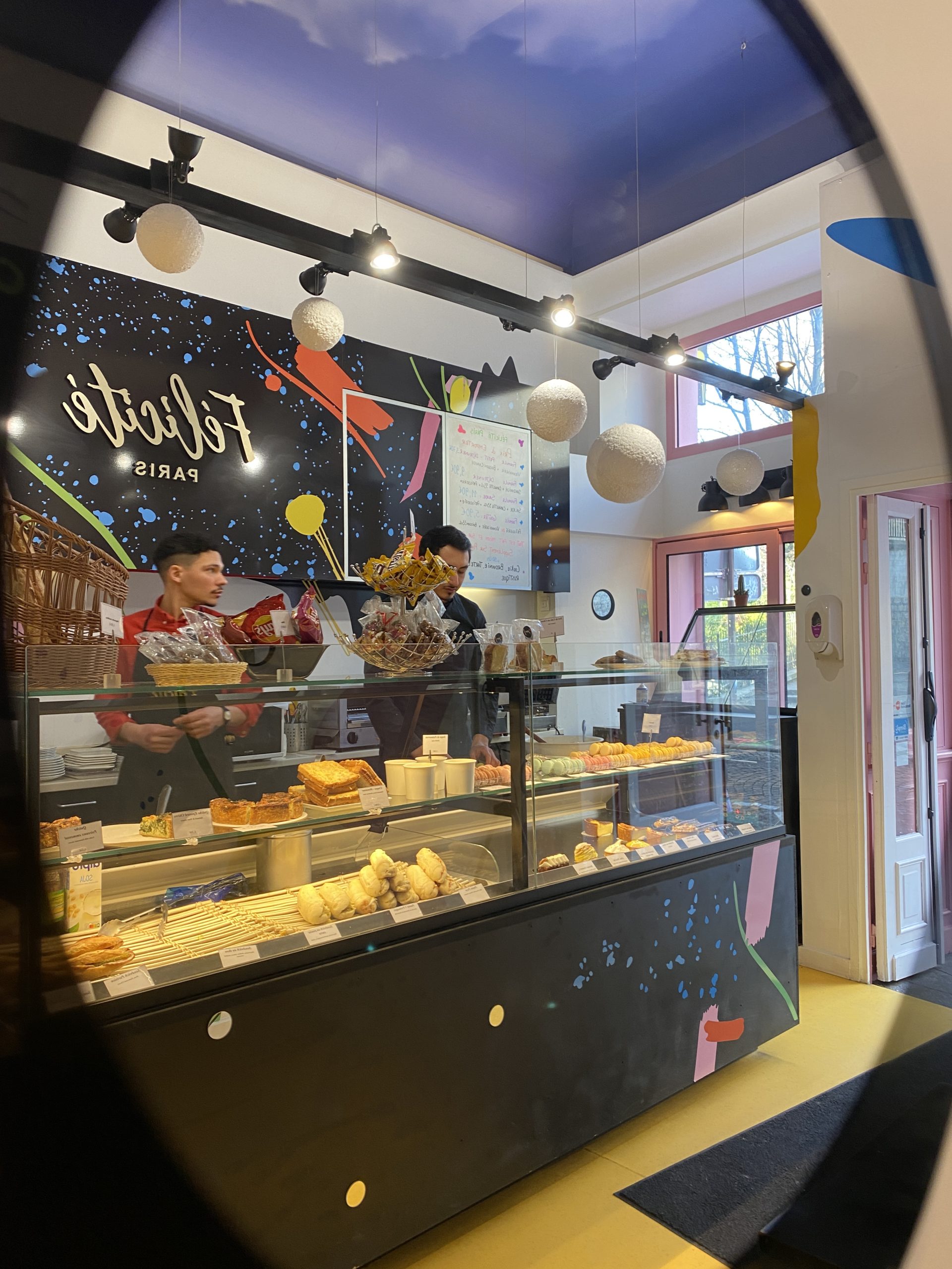 De retour à Paris, ses envies d’entrepreneuriat ne le quittent pas et le hasard le pousse à visiter le 1 rue Tardieu, anciennement Häagen-Dazs et lorgné par Alain Ducasse, dont la boutique ne verra pas le jour. En visitant le lieu, l’idée folle d’en faire sa propre pâtisserie se dessine. Cerise sur le gâteau, c’est en descendant au sous-sol qu’il découvre un laboratoire insoupçonné. Ni une, ni deux, une campagne de crowfunding est lancée. 15 000 euros plus tard, les banques sont convaincues, les investisseurs affluent et la famille et les amis gonflent le capital. Une délicieuse aventure démarre et la boulangerie-pâtisserie ouvre ses portes en septembre 2021. Loin des codes classiques, chez Félicité le ciel est bleu toute l’année (en témoigne le plafond), les murs ne jurent que par des couleurs pop et les miroirs seventies reflètent à merveille les croissants aux couleurs de l’arc-en-ciel. Ici, les viennoiseries ne font pas dans la sobriété et mettent du baume au cœur quelle que soit votre humeur. Si vous passez le midi, on vous recommande les quiches maisons et les soupes de saison. En ce moment c’est potimarron, chèvre, miel et noisettes torréfiées. En fonction de la météo, on peut déjeuner sur place ou dans le square Louise Michel. Côté sucré, vous ne pourrez pas être déçu par le flan Parisien à la vanille de Madagascar, réalisé sans œufs. Ni par les croissants pur beurre aux notes de miel de fleurs. Et encore moins par le Paris-Brest praliné aux noisettes caramélisées.
