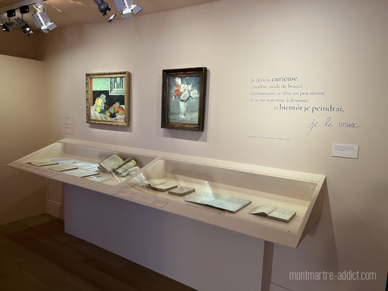 Il s’agit donc d’une exposition très écrite, les près de 80 œuvres présentées (peintures, sculptures, dessins, lithographies, manuscrits, éditions, correspondances originales, documents photo et vidéo) faisant écho aux citations de Fernande sur les murs. Mais il s’agit surtout d’une exposition passionnante à plus d’un titre, qui va bien au-delà de l’œuvre artistique. On y découvre la vie et le combat d’une femme forte, intelligente, portant un regard particulièrement cru et réaliste sur la condition des femmes ; un témoignage rarissime, beaucoup d’archives de ce type ayant été détruites par les familles. Une installation contemporaine d’Agnès Thurnauer vient également rappeler combien les violences conjugales vécues par Fernande avant sa rencontre avec Picasso restent d’actualité.