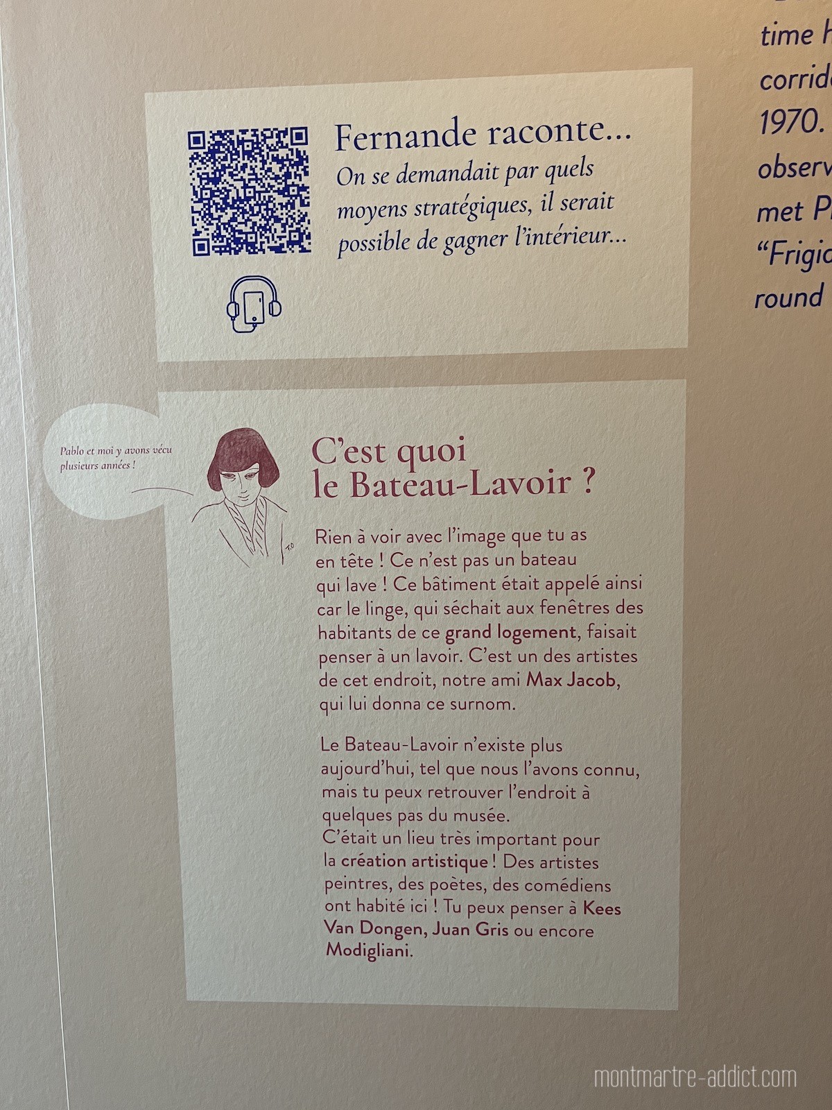 Au-delà de la mise en scène, particulièrement réussie, on notera la présence de cartels à destination des enfants, grâce auxquels les plus jeunes découvriront l’histoire de Fernande Olivier et Pablo Picasso. Un audioguide téléchargeable donne quant à lui la parole à Fernande, et permet aux visiteurs de pénétrer de manière encore plus réaliste dans l’intimité du Bateau Lavoir. Mais surtout, c’est une manière unique et ultra privilégiée de pouvoir admirer des œuvres de Picasso, Van Dongen, Juan Gris ou Suzanne Valadon prêtées par les grands musées nationaux.