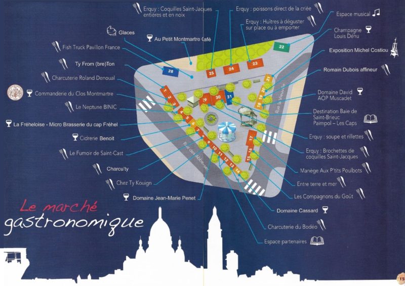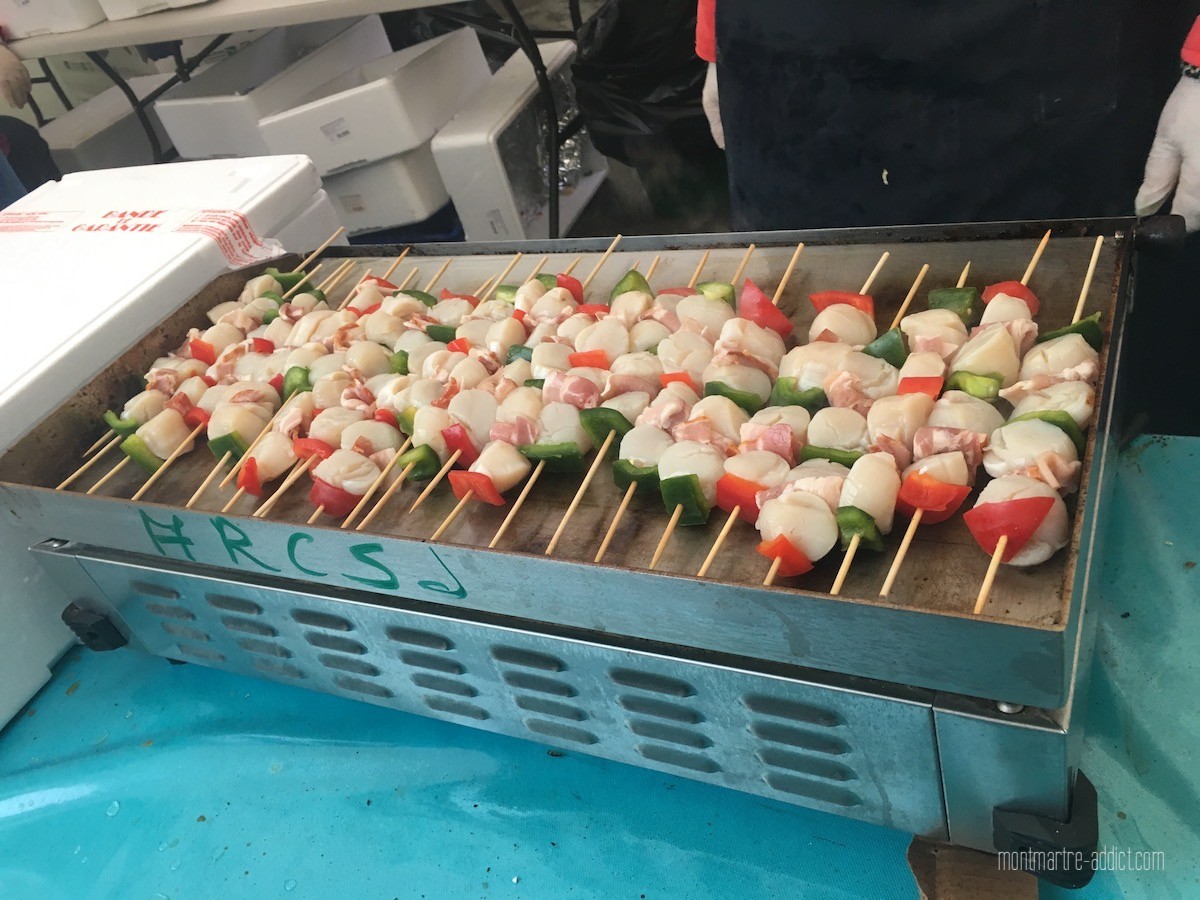 Durant deux jours, la mer s’invite aux Abbesses, Si la reine de la fête reste incontestablement la fameuse coquille Saint-Jacques d’Erquy (que l’on peut emporter ou déguster sur place sen brochettes, un must absolu !), les autres produits de la mer seront également à l’honneur : huîtres de la Fresnaye élevées au pied du Cap Fréhel, poissons, coquillages et autres crustacés, ainsi que de nombreuses autres spécialités bretonnes.