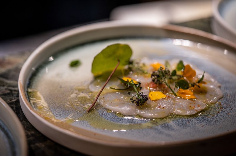 Saint-Jacques de la Baie d’Erquy en carpaccio, vinaigrette au citron caviar « Travaillée en toute élégance et simplicité et aromatisée d’une vinaigrette et un sorbet au citron caviar, la Saint-Jacques de la Baie d’Erquy est un produit fin que l’on aime travailler aux Tantes Jeanne et au RIWI. Fraîche et légère, cette entrée est parfaite pour commencer le repas sur des notes acidulées qui réveillent les papilles.«