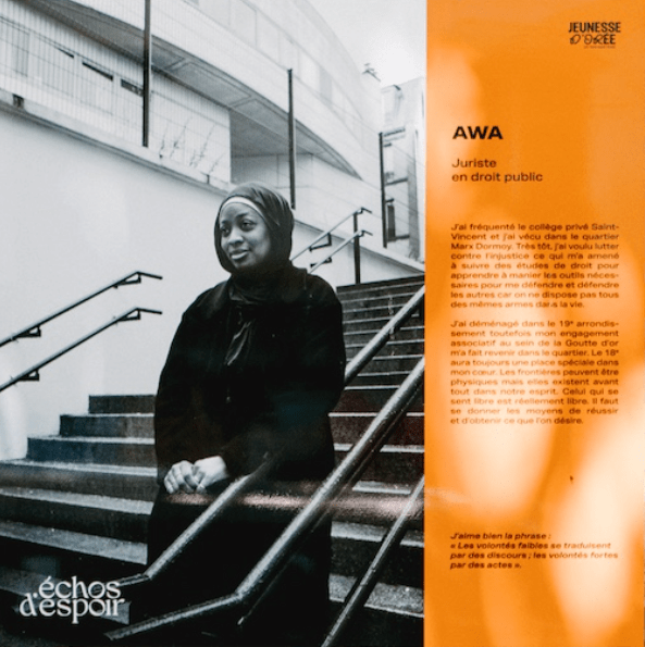 L’exposition « Echos d’Espoir » met en lumière vingt personnalités qui ont grandi ou vivent dans le quartier de la Goutte d’Or. À travers ces photos, nous suivons le parcours de ces jeunes qui parviennent à dépasser les déterminismes sociaux et réalisent leurs aspirations malgré les nombreux défis et en dépit de la mauvaise réputation du quartier.