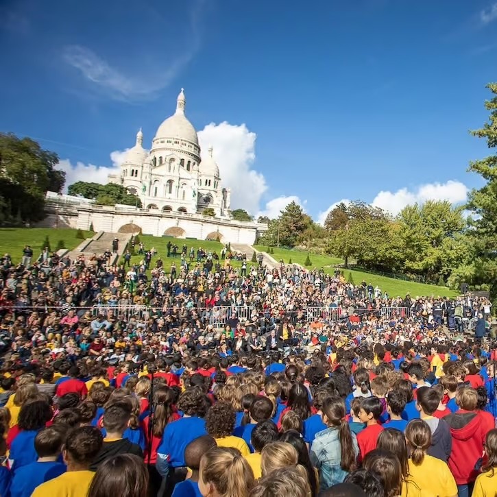 Au pied de la butte Montmartre, les enfants des écoles du 18e arrondissement chantent l’enfance, les rêves d’avenir, les souvenirs et la jeunesse dans une chorale dirigée par Françoise Albin et les professeurs de musique de la ville de Paris.