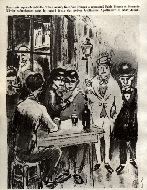 Dès lors, Apollinaire rendra fréquemment visite à ses amis, satisfaisant ici « un grand besoin jusque-là contrarié et inassouvi d’interaction littéraire et artistique« . Il y côtoiera entre autres Van Dongen, Juan Gris, Modigliani ou encore Georges Braque et Raoul Dufy. Et si le Bateau-Lavoir est le point névralgique du passage d’Apollinaire à Montmartre, il n’en fréquente pas moins les bars et cabarets alentours, tels le Bar Fauvet, chez Azon, Au Zut, ou encore plus loin le Lapin Agile.