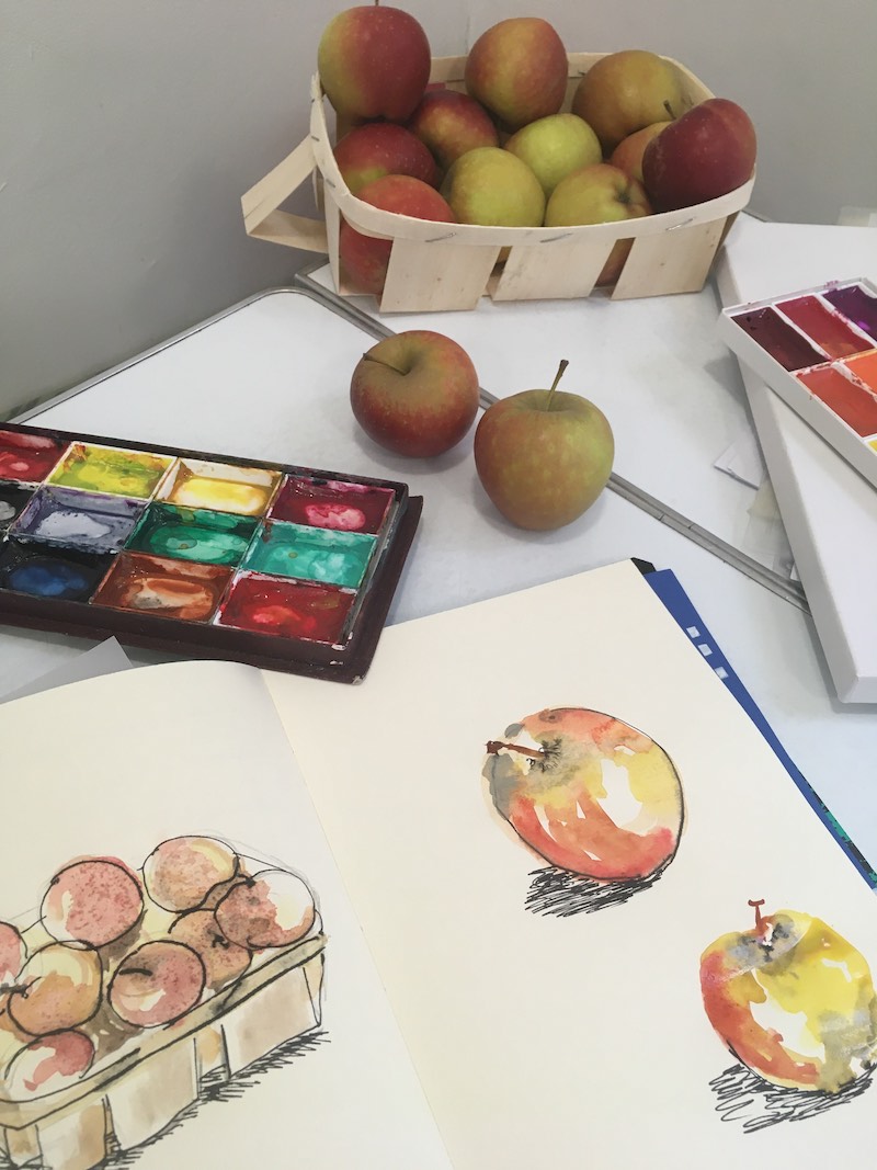 A l’aquarelle et stylo plume noir, les fruits et légumes avant de les croquer sont un bon sujet !