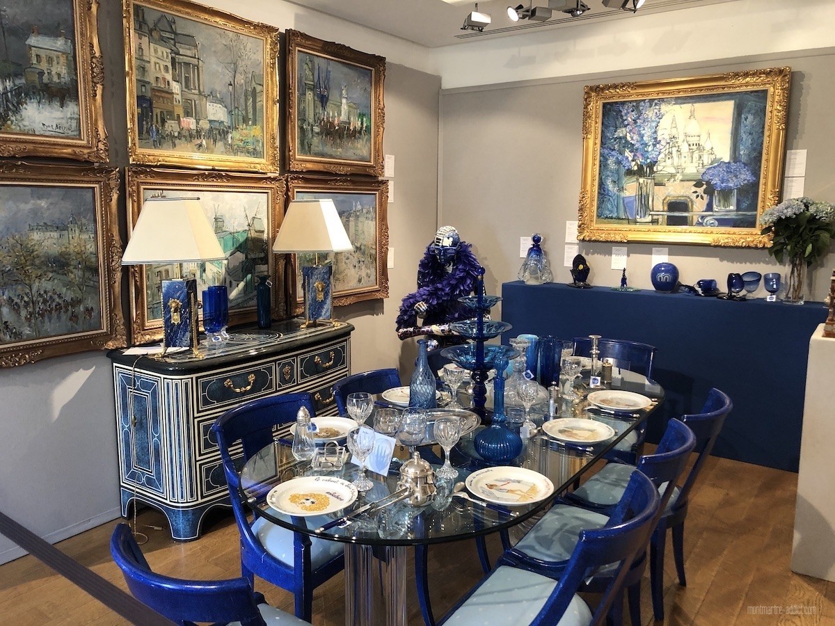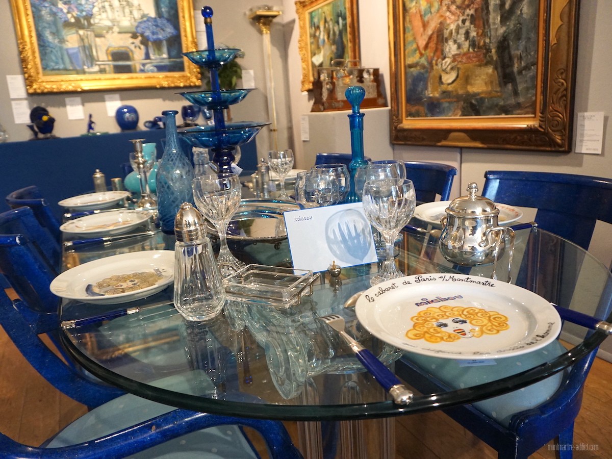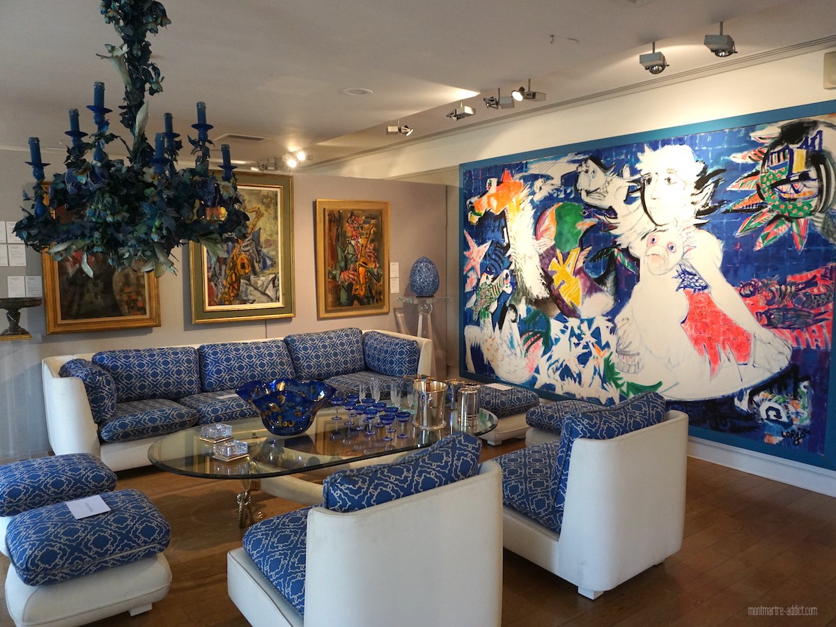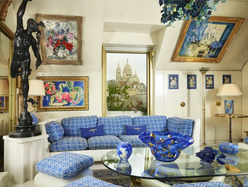 Pour l’occasion, l’univers de Michou a été entièrement reconstitué au sein de l’Hôtel Marcel Dassault à Paris. Niché au sommet d’un immeuble tout proche du cabaret, l’appartement montmartrois, qui offrait une vue imprenable sur Paris et le Sacré Cœur, était à l’image de son propriétaire. Toute sa vie durant, Michou a ainsi accumulé une collection impressionnante d’œuvres modernes, sculptures néoclassiques, mobilier et objets d’art à dominante bleue.