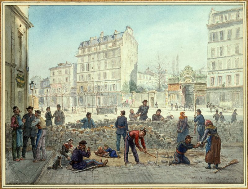 Thiers quitte alors Paris pour Versailles, tandis que le Comité Central de la Garde Nationale envahit l’Hôtel de Ville et décide d’organiser des élections, au terme desquelles la Commune est proclamée le 28 mars, en référence à la Commune insurrectionnelle ayant mis fin à la monarchie en 1792. Paris essaie alors de s’organiser politiquement en constituant neuf commissions, où siègent des élus issus du peuple, ouvriers, artisans, journalistes, avocats ou artistes, tous républicains, socialistes ou anarchistes. Dans le 18e, on retiendra les noms d’Auguste Blanqui, Simon Dereure, Jean-Baptiste Clément et Théophile Ferré pour les plus connus. Alors que les ateliers de production sont réquisitionnés par les Communards et gérés par les ouvriers, la gratuité des loyers est instaurée durant quelques mois, l’école devient obligatoire et laïque, le salaire des instituteurs est multiplié par deux, et de nombreux clubs de discussion sont créés, auxquels participent aussi bien des hommes que des femmes.