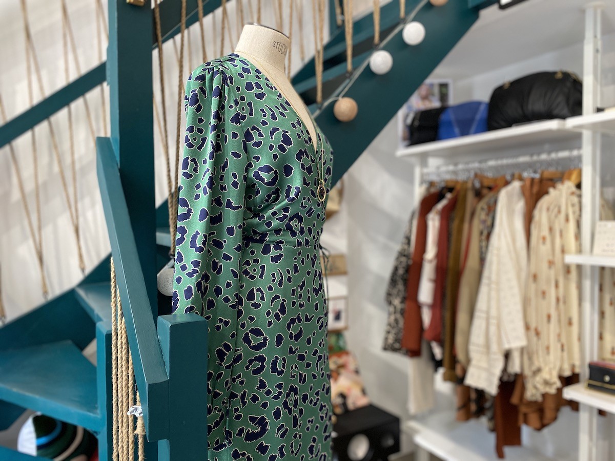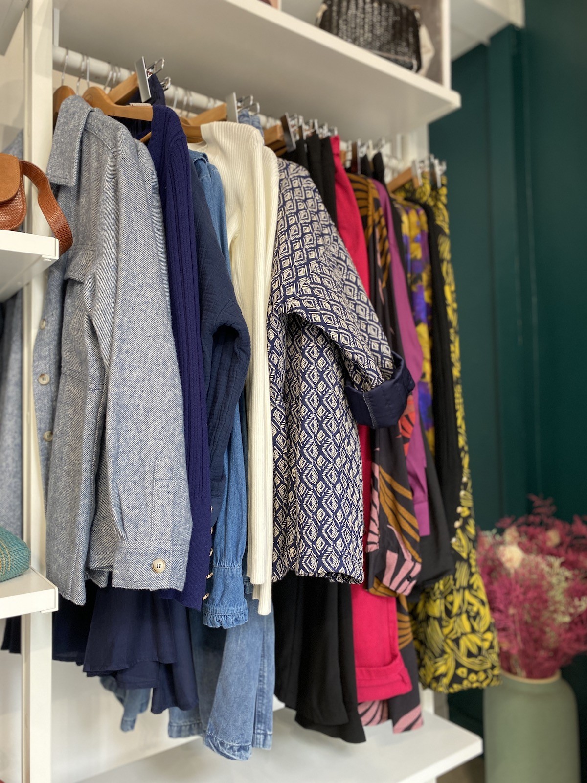 En ce début d’automne, on a repéré une robe de mi-saison imprimée léopard, des tuniques brodées en lin lavé et des vestes molletonnées façon kimono qu’on avait très envie d’enfiler ! Disposés par ci, par là, des sacs Nat & Nin, Bensimon ou Maradji en cuir, en velours et même imperméables, pour lesquels il est difficile de ne pas craquer. Ici aussi, la banane s’impose comme l’accessoire indispensable de toute montmartroise en vogue. Et c’est auprès de marques comme Hindbag que Donia se fournit pour ses matières bio et sa production éthique réalisée par une ONG qui défend l’émancipation des femmes.