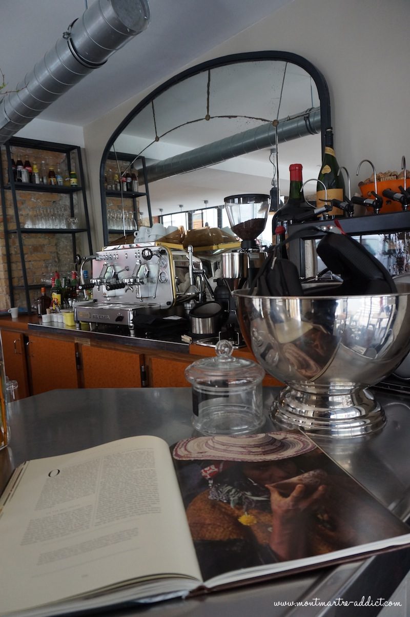 On est d'abord séduit par la décoration de l'endroit, dans un esprit très brut, briques, parquet, chaises en acier et tables bistro, objets authentiques et chinés, et on remarque immédiatement, hormis le sublime bar, la verrière en fond de salle derrière laquelle oeuvrent les cuisiniers.