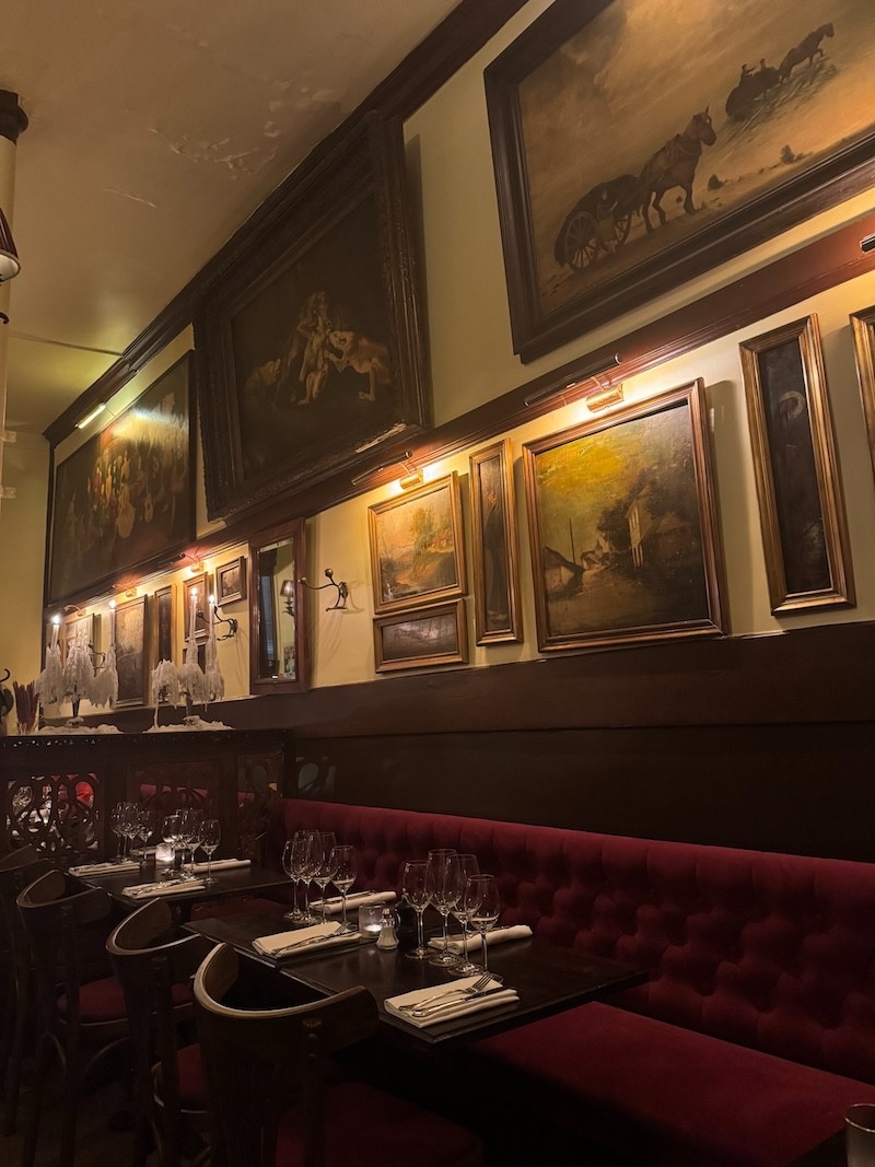 Repris au printemps 2025 par l’ancienne équipe du Petit Bouillon Pharamond, Le Bon Bock semble avoir conservé son décor d’origine, offrant une véritable immersion dans l’atmosphère de la Belle Époque. Ses murs toujours ornés de tableaux, son vieux comptoir, ses lumières tamisées et son piano d’époque légèrement désaccordé dans la salle du fond recréent l’ambiance des soirées d’autrefois.