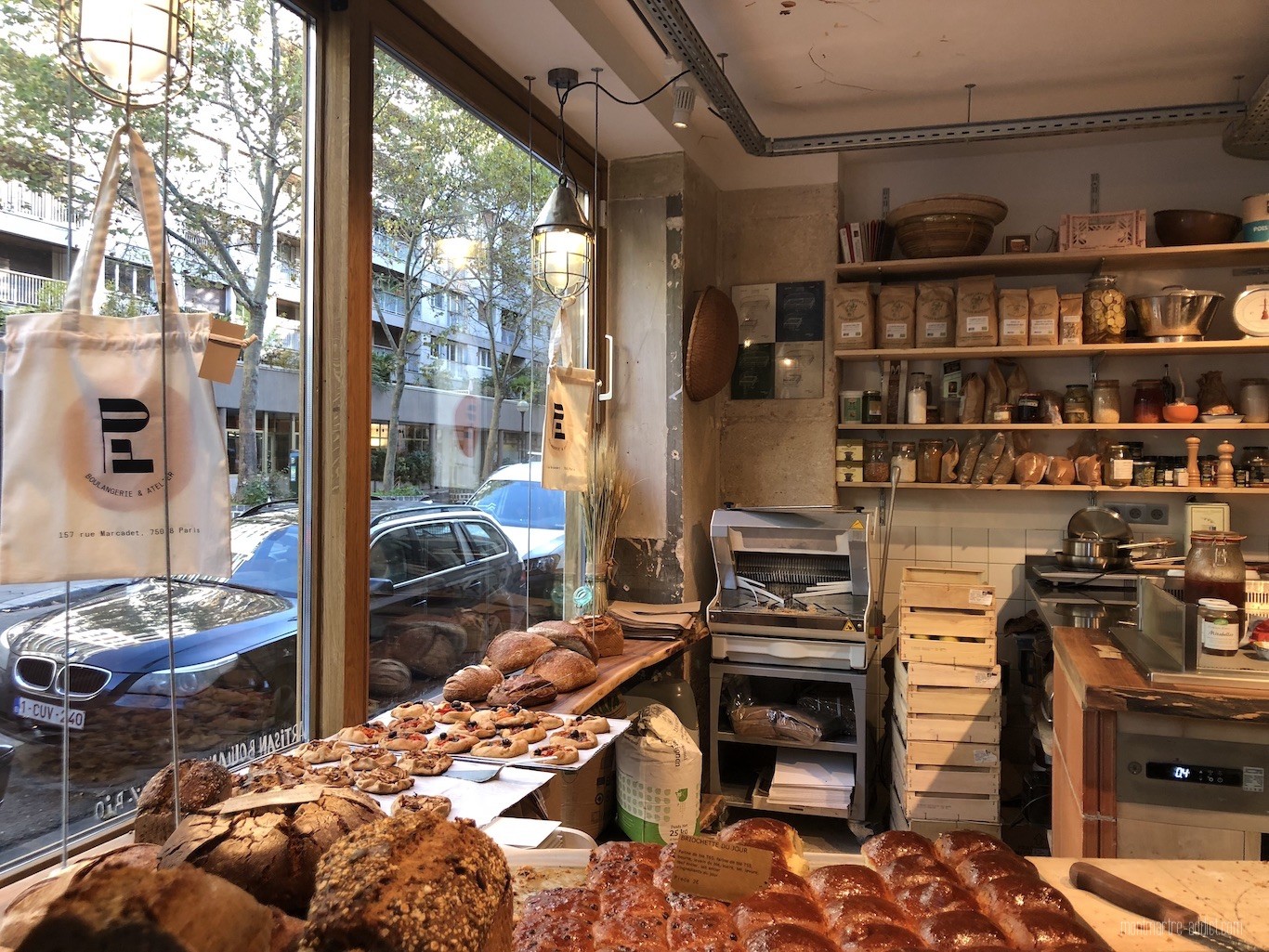 Il murit son concept autour d’un lieu de vie, et commence à proposer chez lui rue Francoeur des ateliers AirBnB pour apprendre à fabriquer son propre pain. C’est en arpentant la rue Marcadet qu’il repère un bel espace à l’angle de la rue des Cottages, idéal pour concrétiser son projet. Clairement, l’Atelier P1 n’a rien d’une boulangerie traditionnelle. D’abord parce qu’on n’y trouve pas de baguettes, mais uniquement des pains fabriqués à base de farines biologiques avec fermentation au levain. Ensuite parce que le fournil est ouvert sur l’espace de vente. Enfin parce que dans cet espace, Julien continue de proposer deux fois par semaine des ateliers pour apprendre à faire son propre pain au levain.