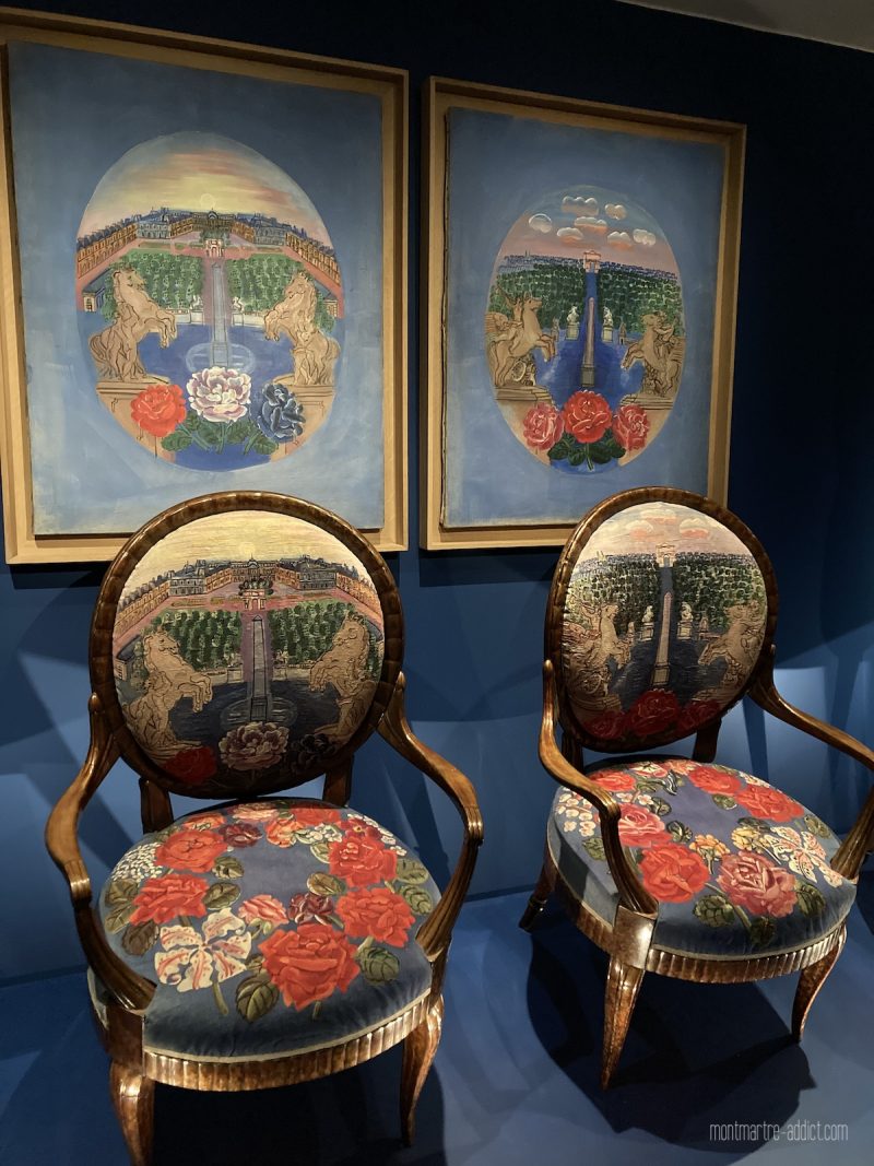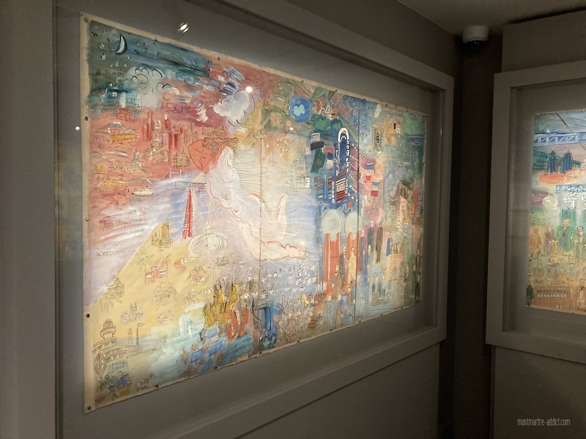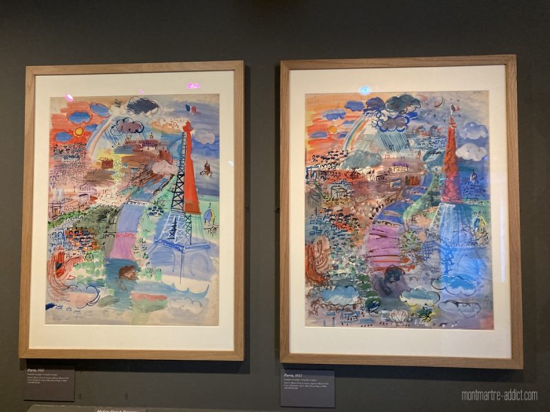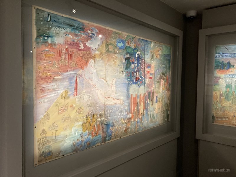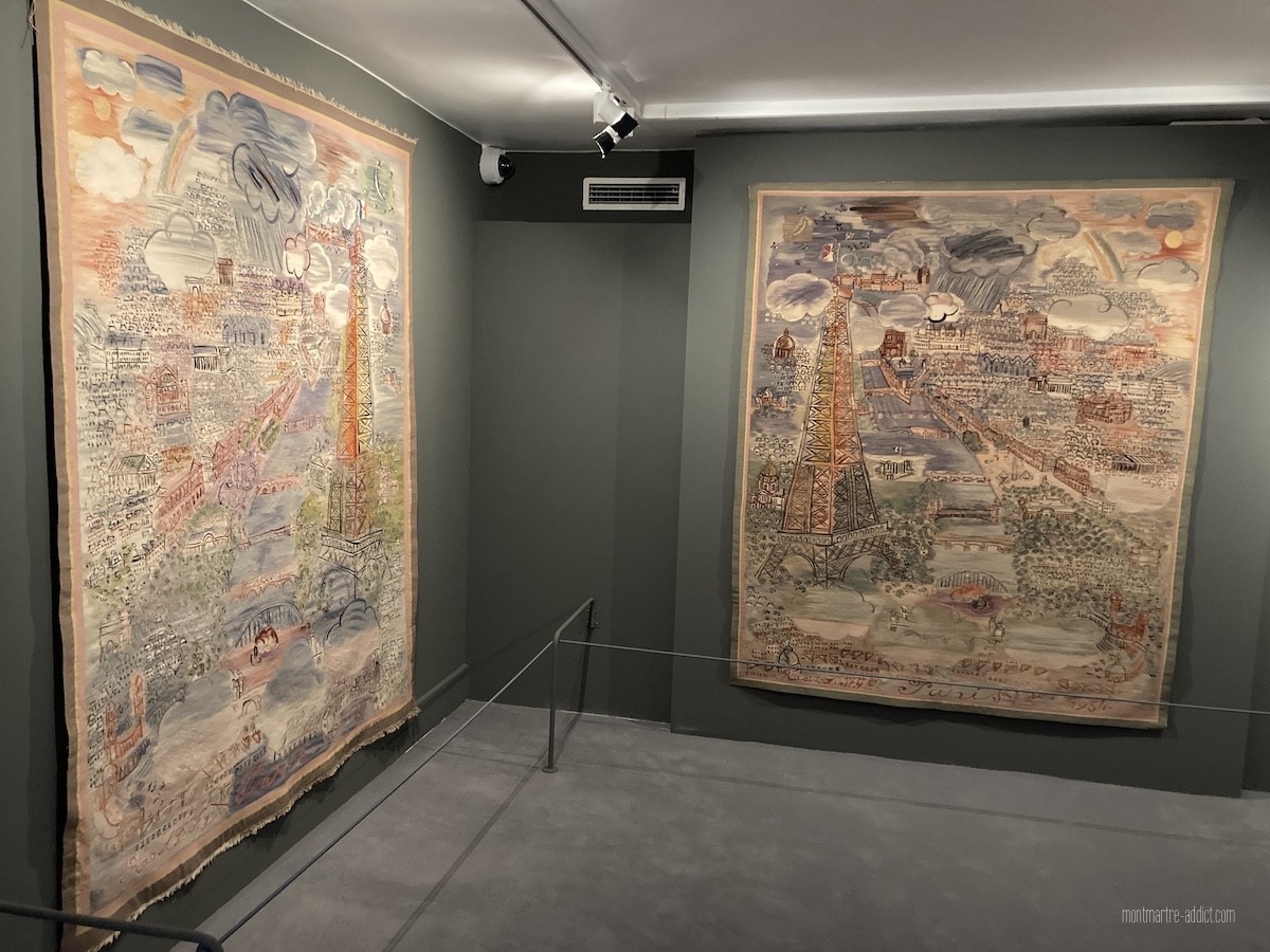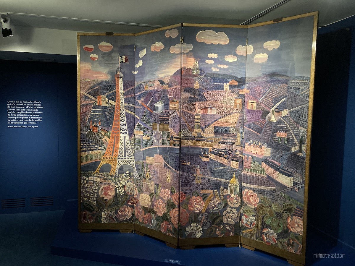 On retrouve dans l’exposition ces fameuses vues de Paris, ainsi que plusieurs tableaux mettant en scène son atelier, mais également tout ce qui fait la richesse de l’œuvre de Dufy, son intérêt pour les arts décoratifs s’affirmant au fil des années. Ainsi, on découvre l’ensemble de mobilier réalisé sur le thème de Paris et rendant hommage à ses monuments, tout comme le paravent qui reprend le concept de son Paris à vol d’oiseau peint en 1925 pour une tenture pour Poiret. Cette façon que Dufy a de représenter Paris vu d’en haut et ses monuments vus de face laisse à penser qu’il a pu passer de longues heures en haut de la Butte pour s’inspirer du panorama.