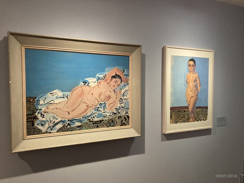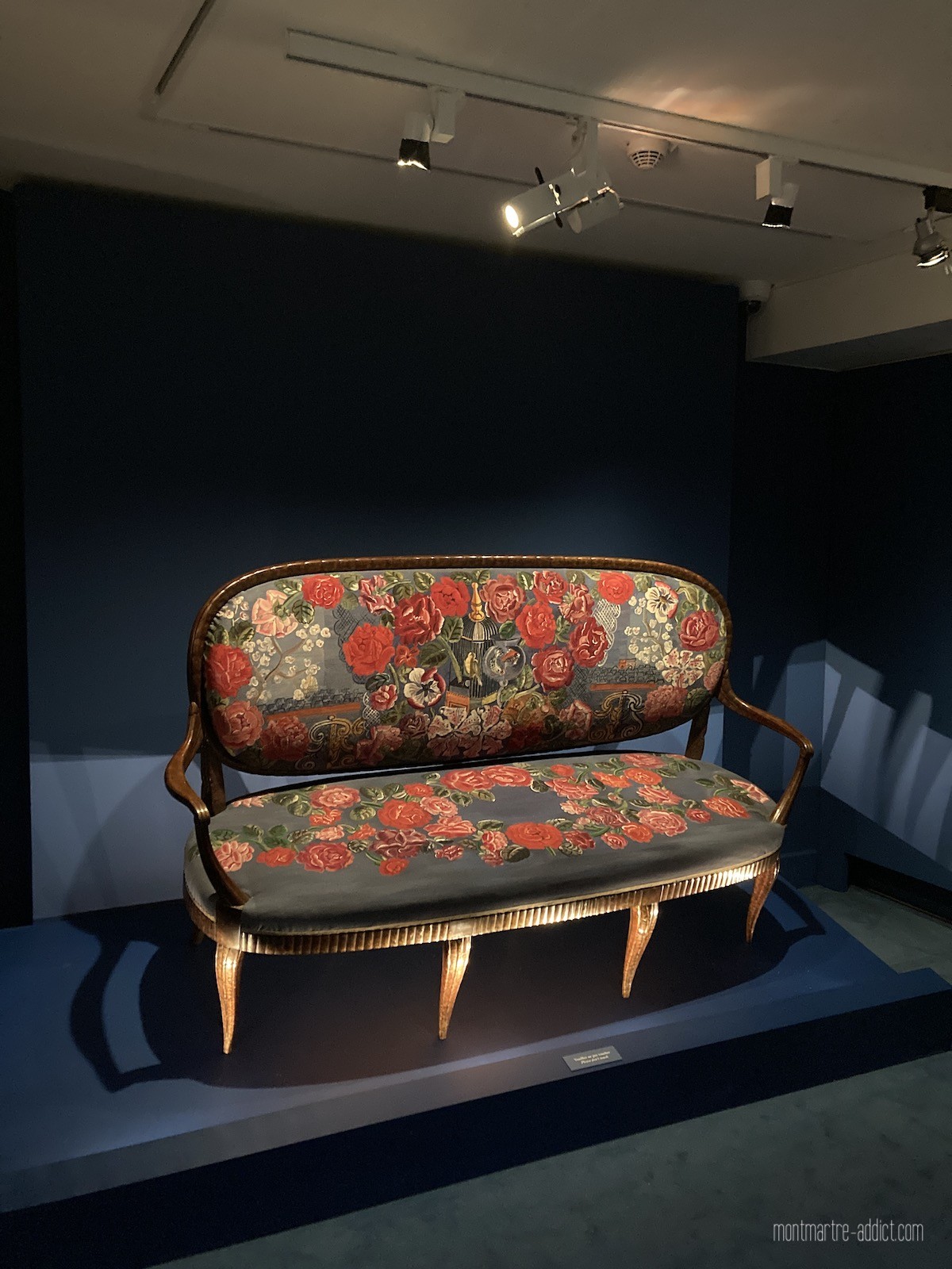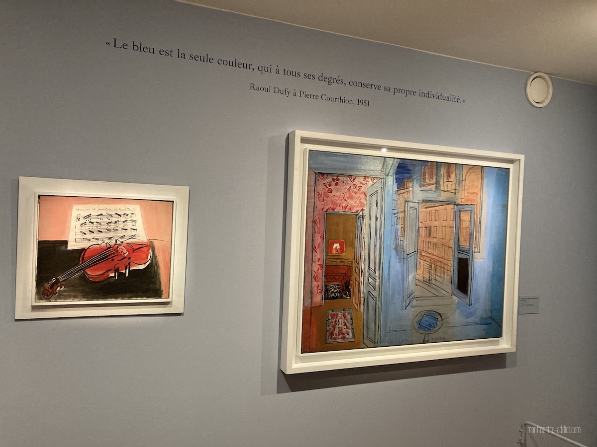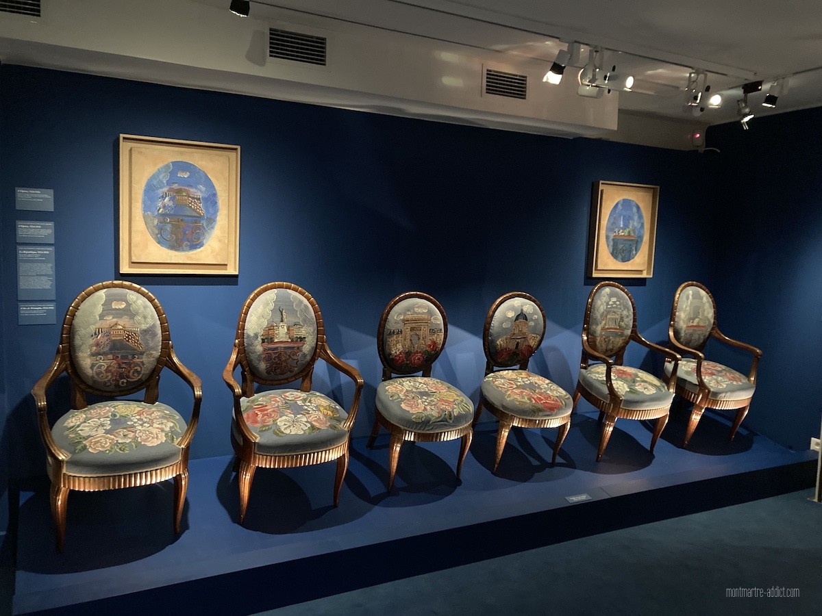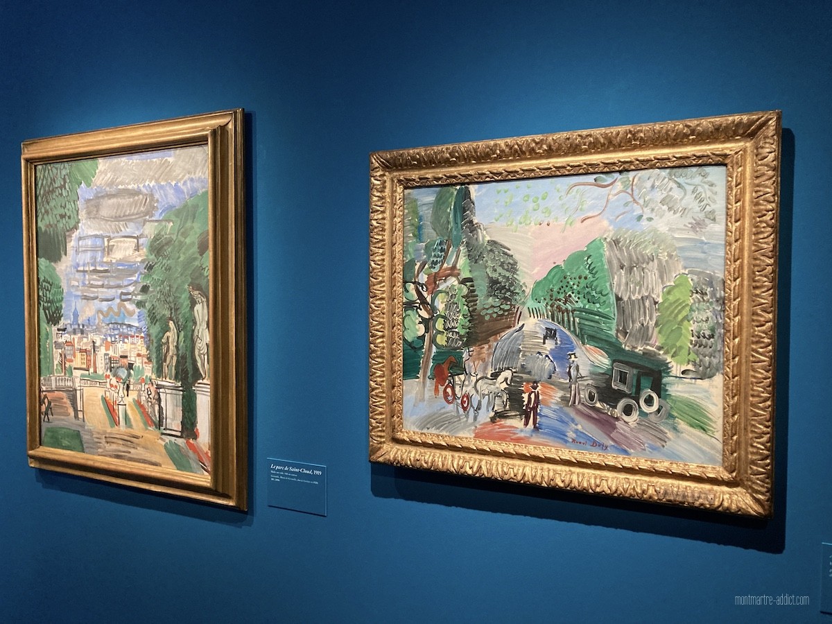 On retrouve dans l’exposition ces fameuses vues de Paris, ainsi que plusieurs tableaux mettant en scène son atelier, mais également tout ce qui fait la richesse de l’œuvre de Dufy, son intérêt pour les arts décoratifs s’affirmant au fil des années. Ainsi, on découvre l’ensemble de mobilier réalisé sur le thème de Paris et rendant hommage à ses monuments, tout comme le paravent qui reprend le concept de son Paris à vol d’oiseau peint en 1925 pour une tenture pour Poiret. Cette façon que Dufy a de représenter Paris vu d’en haut et ses monuments vus de face laisse à penser qu’il a pu passer de longues heures en haut de la Butte pour s’inspirer du panorama.