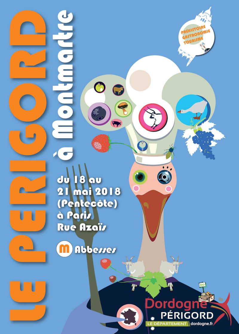 Du 18 au 21 mai 2018, le Conseil Général de la Dordogne nous donne rendez-vous autour du Sacré Coeur pour le 11e édition du Périgord à Montmartre. Durant quatre jours, une quarantaine de stands représentant le meilleur de gastronomie périgourdine, mais également du tourisme et de la culture, vous feront découvrir les trésors de ce territoire riche en histoire. Producteurs et viticulteurs régionaux vous permettront de goûter entre autre foie gras, fraises, fromages, miel, escargots, truffe, safran, etc… sans oublier les fameux vins de Bergerac !