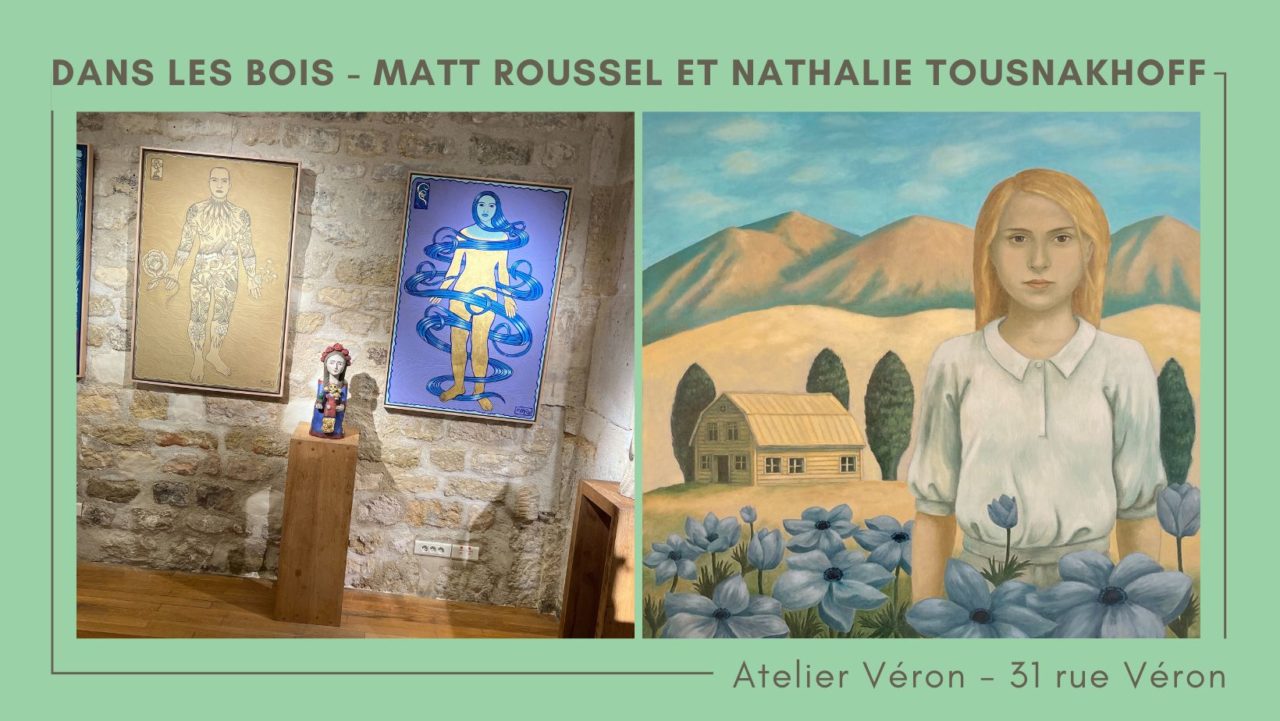 Nathalie Tousnakhoff peint à l’huile sur bois : des portraits, des maisons, des paysages. Elle aime le contact lisse du bois, l’aspect lustré qu’il donne à la peinture, l’objet matériel que le tableau devient. Elle aime l’idée qu’un tableau ait la nécessité du temps pour sa réalisation, qu’il reflète une certaine préciosité. Elle s’amuse aussi à «recréer» des œuvres de grands maîtres, en leur ajoutant un petit détail à son goût. C’est un bon moyen de passer des heures en compagnie de ces figures admirables. Et puis elle invente des personnages… Matt Roussel puise ses idées dans mon imaginaire, nourri par des lectures (beaucoup de récits d’exploration ethnographiques notamment), des documentaires, des visites dans des musées, des voyages etc. Il fabrique des sculptures en céramique, des gravures sur bois et des bois gravés peints.