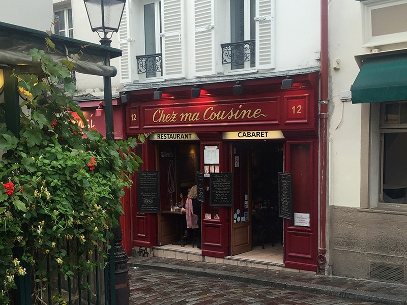 Plus haut en remontant sur la Place du Tertre, Chez Ma Cousine fait également partie des derniers cabarets montmartrois. Fondé en 1928 et d’abord nommé Le Petit Breton, l’établissement a connu son heure de gloire à partir de 1946, ouvrant sa scène à des artistes débutants comme Bourvil, Jean Carmet, Fernand Raynaud ou encore Pierre Perret. Depuis, le cabaret n’a jamais cessé de proposer des dîners-spectacles au cours desquels se produisent toujours de jeunes talents.