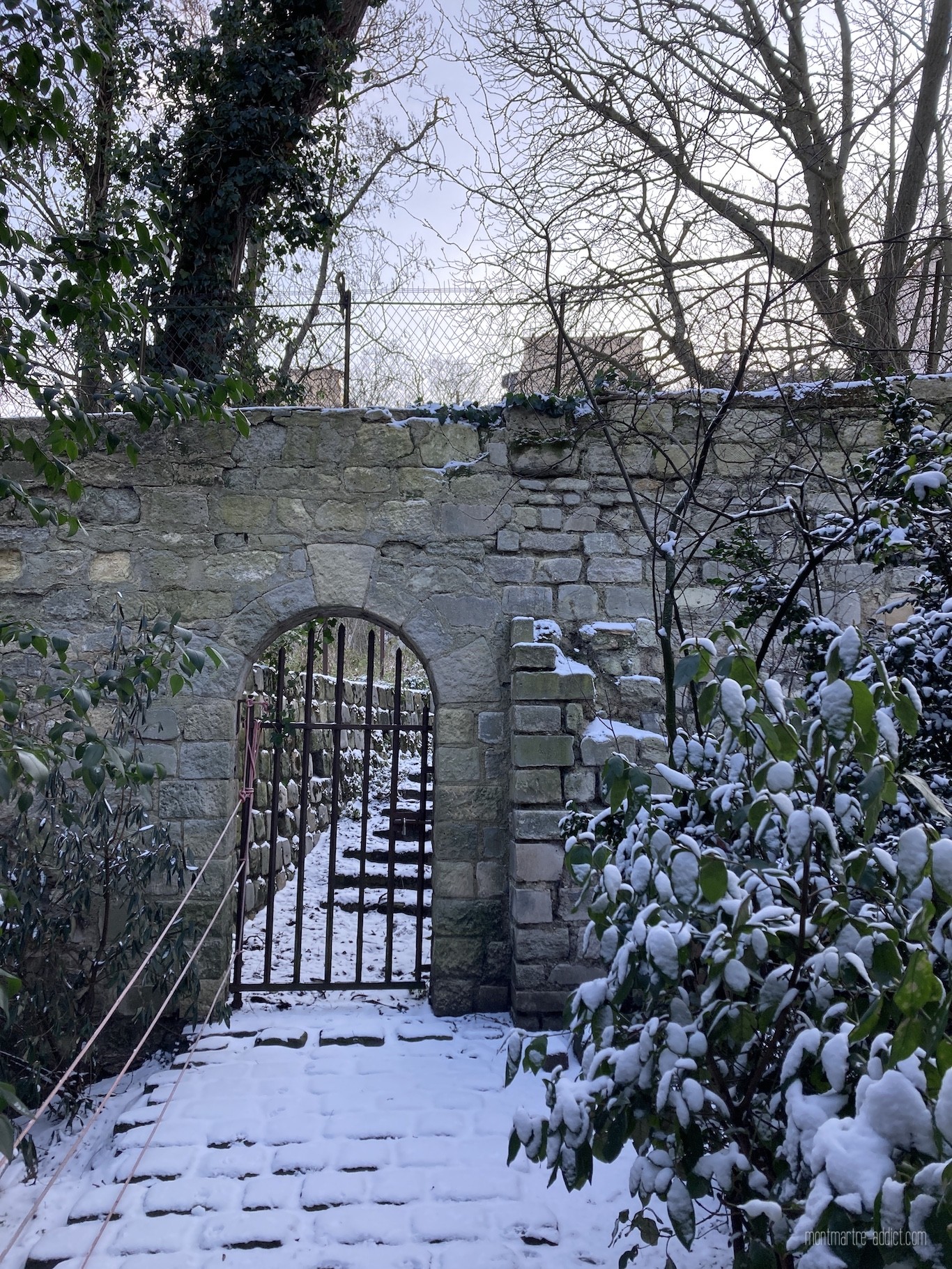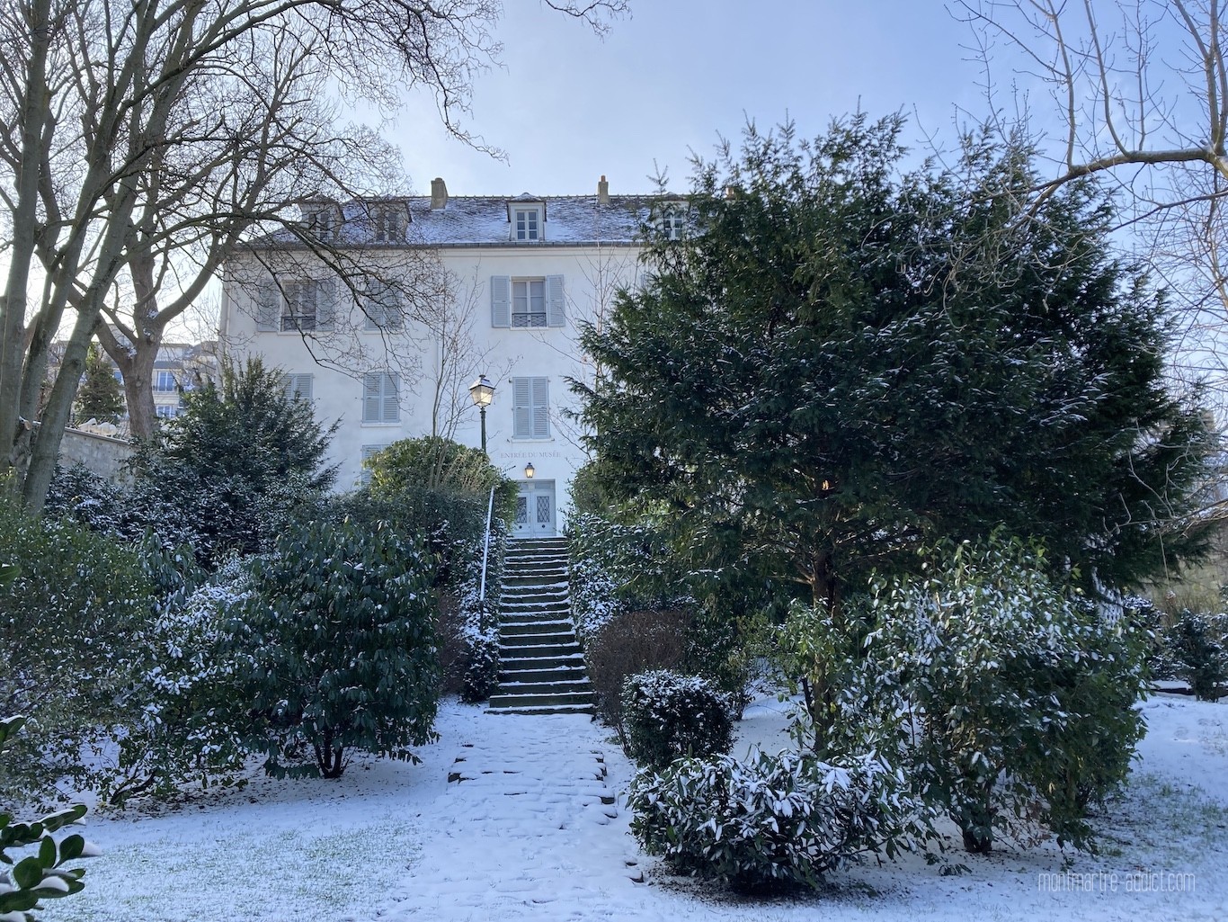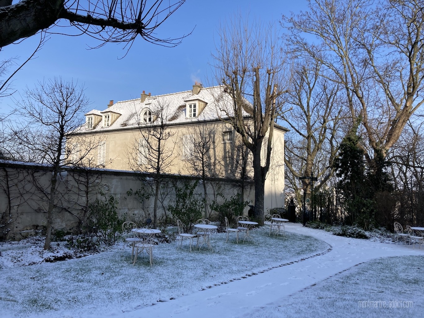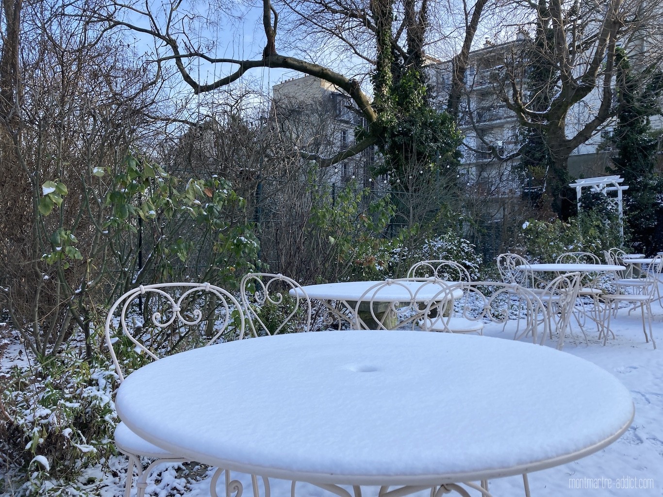 On l’attendait avec impatience, et après une première visite il y a quelques semaines, la neige est enfin tombée sur Montmartre… Malgré le froid polaire qui l’accompagnait, nous n’avons pu décliner l’invitation à aller tôt ce matin dans les jardins Renoir du Musée de Montmartre ; parce que le musée nous manque trop, parce que les jardins Renoir sont magnifiques en toute saison, et parce qu’ils l’étaient encore plus ce matin, comme si une bonne fée les avait recouverts de poudre magique pendant la nuit…
