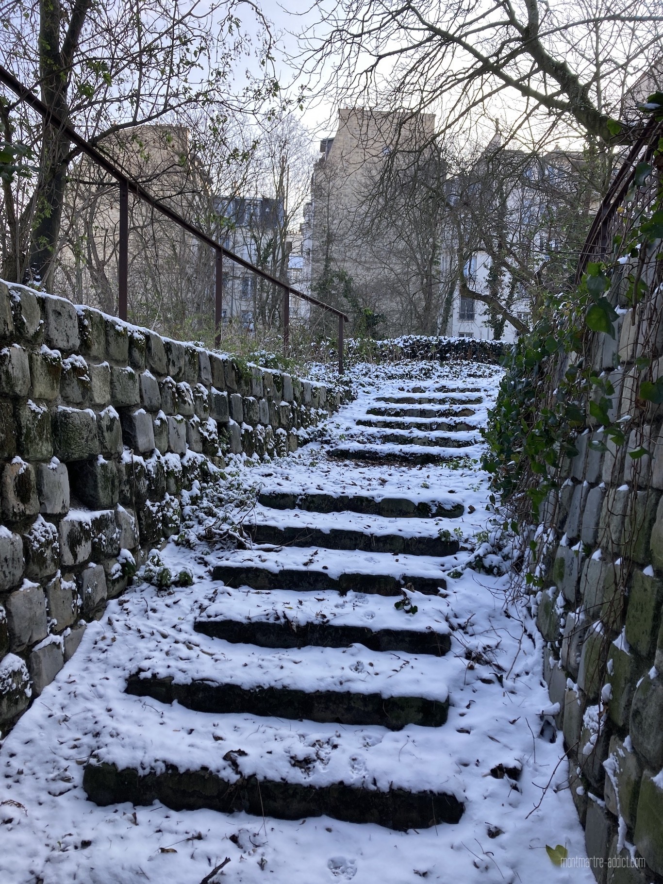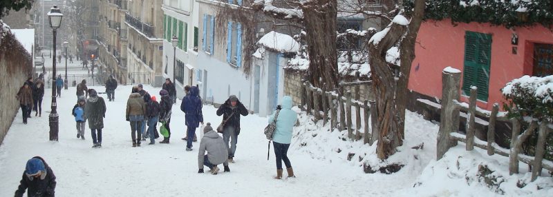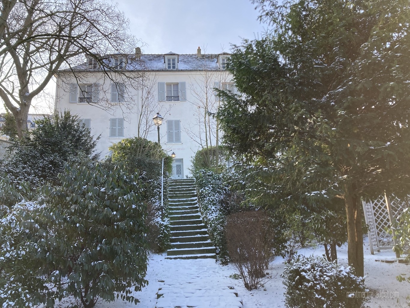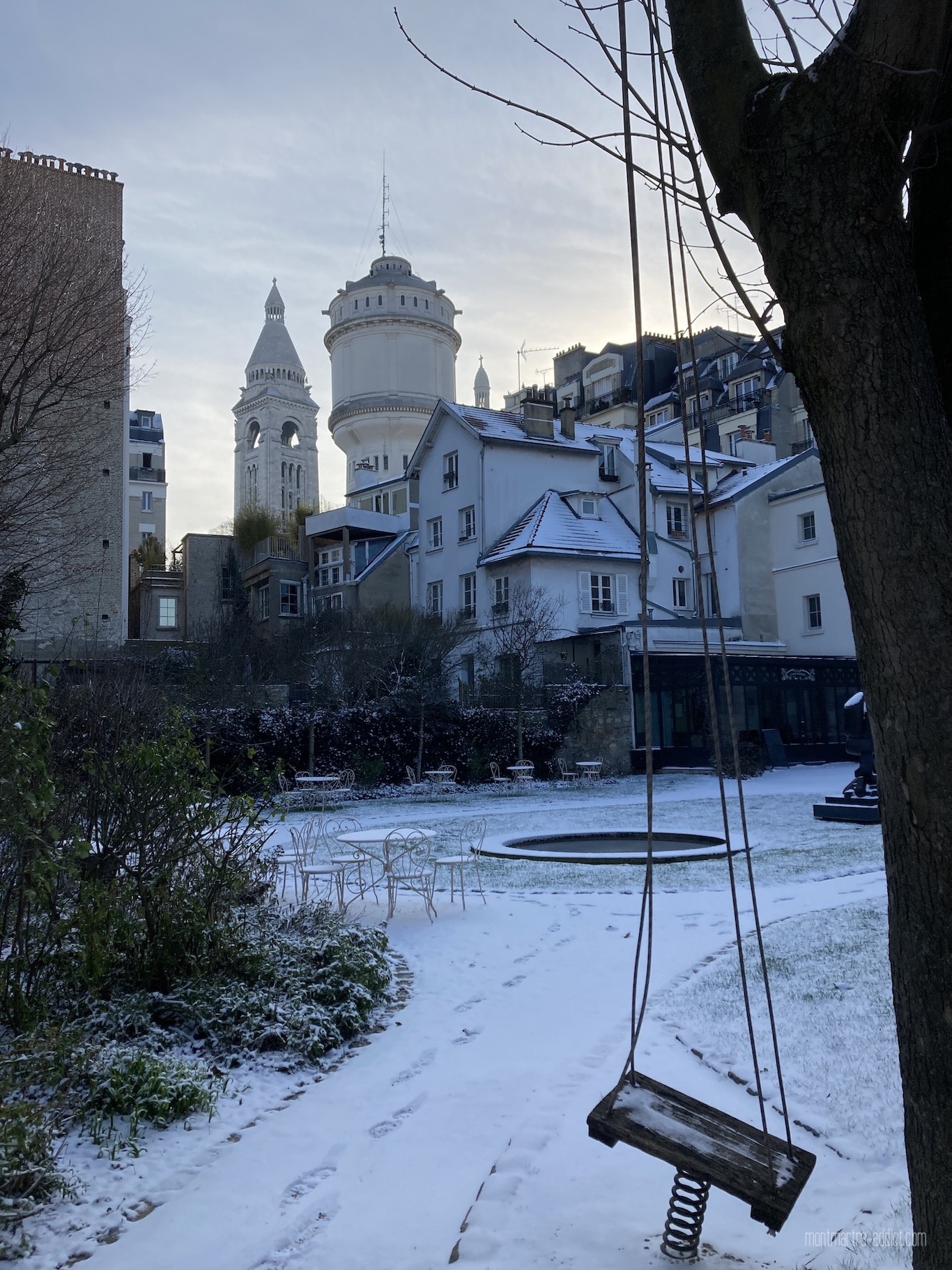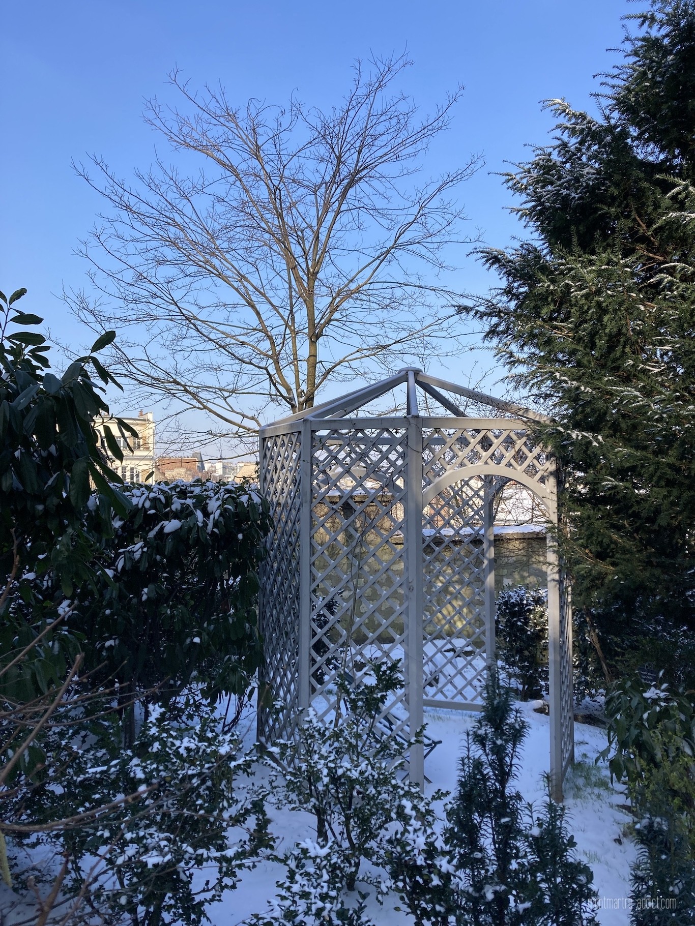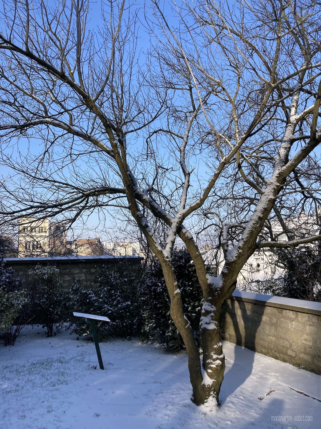 On l’attendait avec impatience, et après une première visite il y a quelques semaines, la neige est enfin tombée sur Montmartre… Malgré le froid polaire qui l’accompagnait, nous n’avons pu décliner l’invitation à aller tôt ce matin dans les jardins Renoir du Musée de Montmartre ; parce que le musée nous manque trop, parce que les jardins Renoir sont magnifiques en toute saison, et parce qu’ils l’étaient encore plus ce matin, comme si une bonne fée les avait recouverts de poudre magique pendant la nuit…