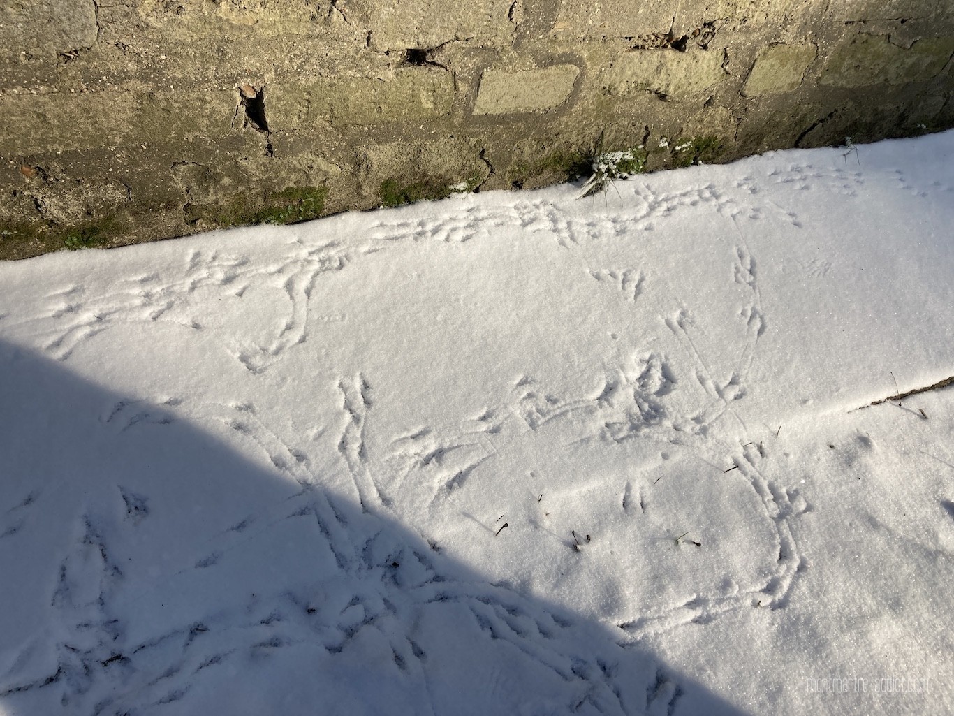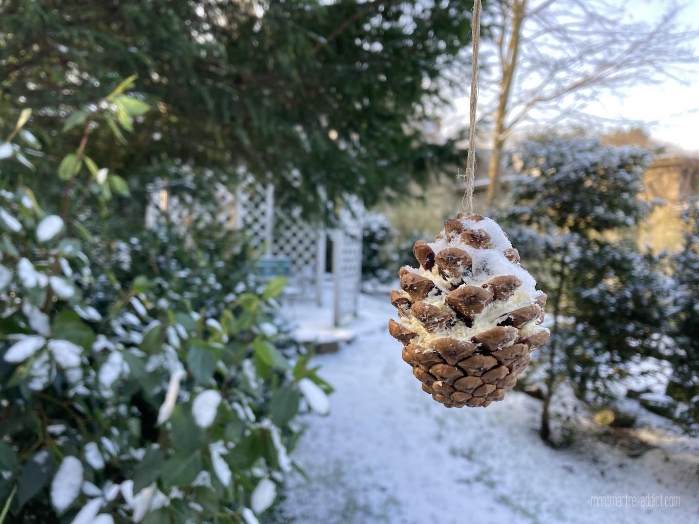Ne vous inquiétez pour le potager, les blettes et les choux ne craignent pas le froid. L’hôtel à insectes remplit bien son rôle et leur sert d’abri durant la période hivernale, tout comme les pommes de pin aux graines accrochées dans les arbres qui permettent aux oiseaux de se nourrir malgré le gel. D’ailleurs, on a repéré des traces de petites pattes toutes fraiches dans la neige.