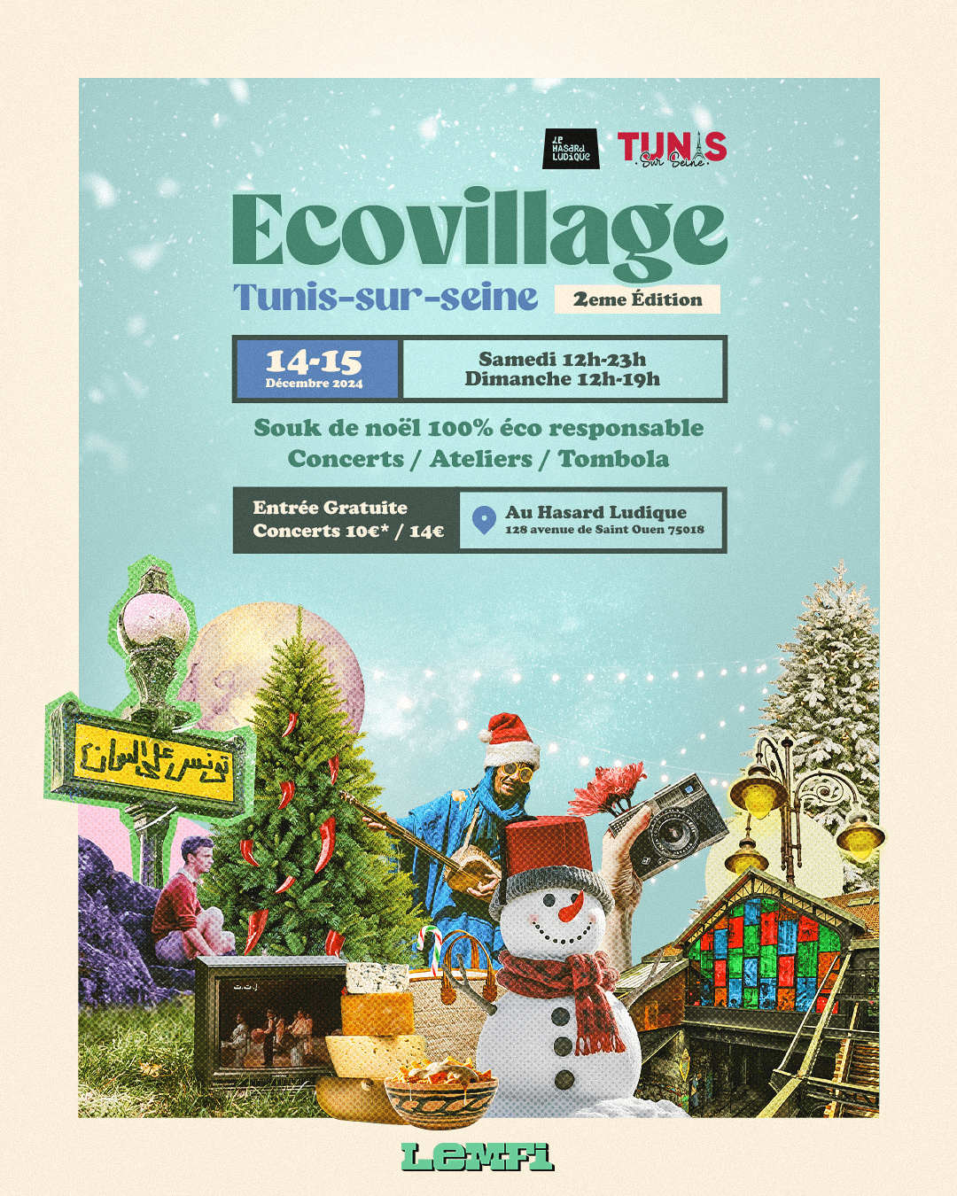 Ecovillage de Noël et Tunis sur Seine vous invitent à plonger dans l’univers de créateurs·ices, de producteurs·ices et d’artisanat contemporain venant de la Tunisie et d’autres horizons. Tunis-sur-Seine a conçu pour vous un Écovillage à l’image d’une fabrique de partage des connaissances, des savoir-faire, des compétences et des initiatives éco-responsables. Grâce à une génération d’artistes et d’acteur•ices engagé•es et plus en phase avec les défis de son temps.