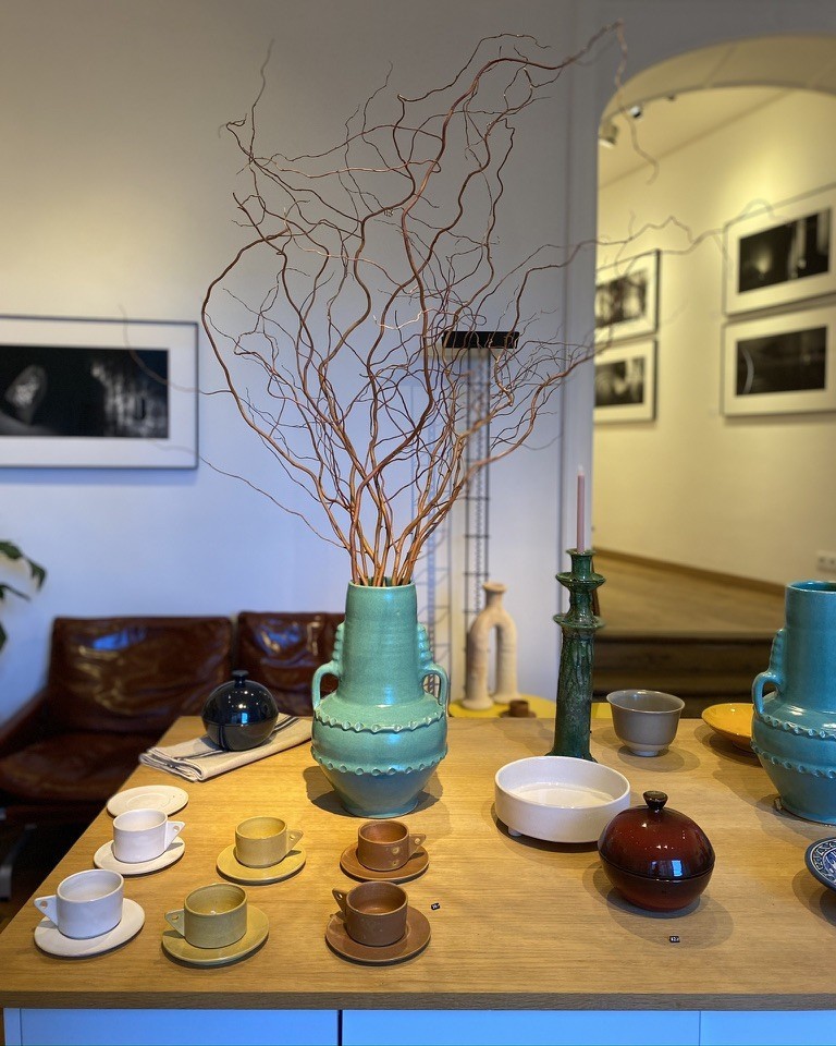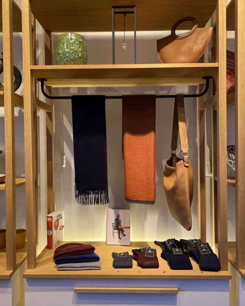Chez Mestiers, on ne trouve que des petites séries, aussi bien pour la maison que pour le prêt-à-porter. On entre dans la boutique de la rue Francoeur pour passer une maille chatoyante, agrémenter une table, prendre en main une des tasses exposées. L’ensemble des céramiques en grès est entièrement tourné et émaillé à la main. Les écharpes, les plaids, les bonnets et les chaussettes en cachemire sont filés, tissés et teints dans de prestigieux ateliers italiens. Les laines prennent une lumière particulière, les vases une couleur singulière, sans jamais perdre de vue l’influence de la matière. Des objets souvent versatiles aux usages multiples, comme ces plateaux pour servir le café ou pour mettre ses fruits au retour du marché. On trouve aussi de la maroquinerie, des accessoires et de l’art ; un sujet auquel Louis tenait beaucoup, lui qui rêvait depuis toujours d’avoir un lieu d’exposition.