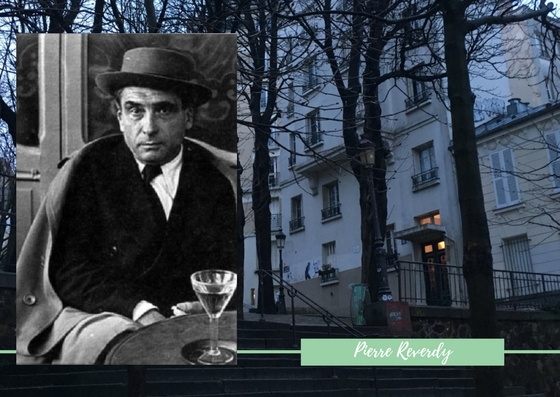 Originaire de Narbonne, Pierre Reverdy est accueilli à son arrivée à Paris en 1910 par son ami le peintre Paul Malaterre, qui vit à Montmartre. Il s’installe à l’Hôtel du Poirier, en face du Bateau Lavoir, puis habite avec Max Jacob au 7 rue Ravignan, avant de passer par le Bateau Lavoir puis par le 12 rue Cortot. Considéré comme le précurseur du surréalisme, il est le fondateur de la revue Nord-Sud, du nom de la ligne de métro reliant Montmartre à Montparnasse.