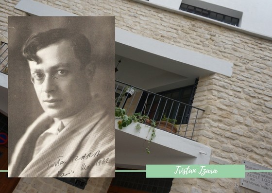 Arrivé en France en 1919, Tristan Tzara se lie très vite d’amitié avec André Breton et Paul Eluard, entre autres. Il est considéré comme le fondateur du dadaïsme. En 1926, il se fait construire une maison au 15 avenue Junot. Conçue par l’architecte autrichien Adolf Loos, la maison, de style moderne et conforme à l’idéal esthétique de Tzara, a été inscrite au titre des monuments historiques en 1975. C’est dans cette maison que naîtra son fils Christophe en 1927.