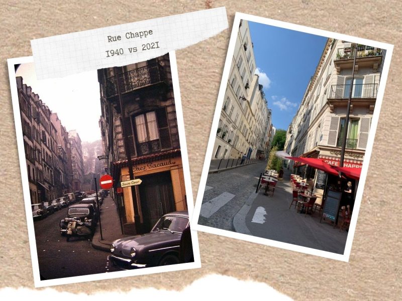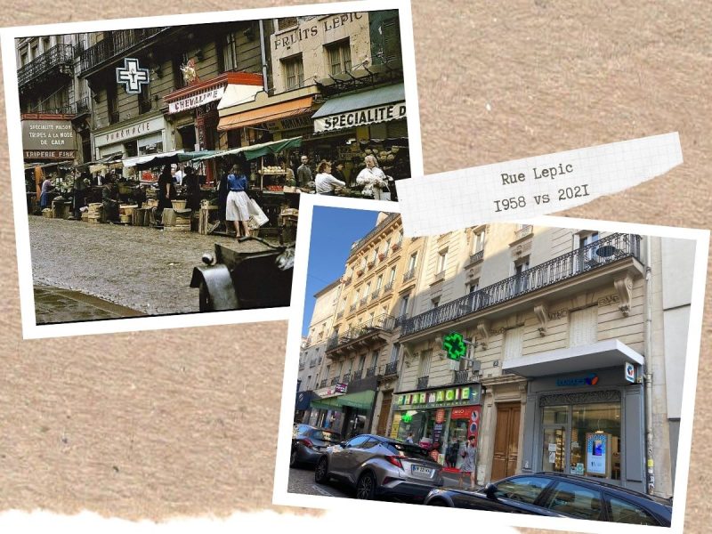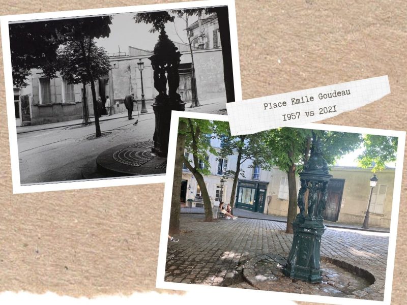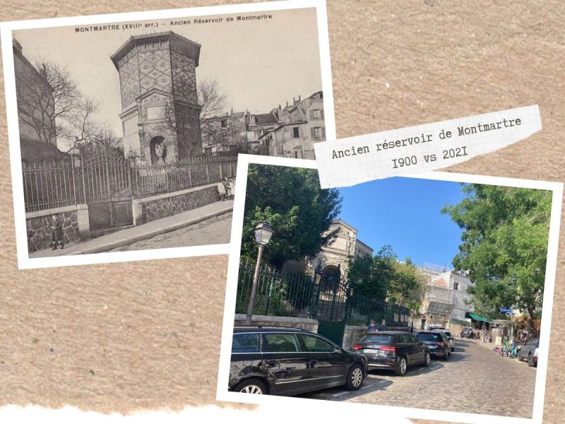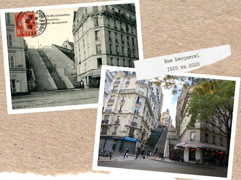 On continue notre balade dans Montmartre à travers le temps, et on s’amuse à jouer au jeu des 7 erreurs ! Si l’ancien réservoir a perdu un étage, la fontaine Wallace de la Place Emile Goudeau n’a pas bougé, l’escalier de la rue Becquerel est toujours aussi raide, et il y a toujours une pharmacie rue Lepic !