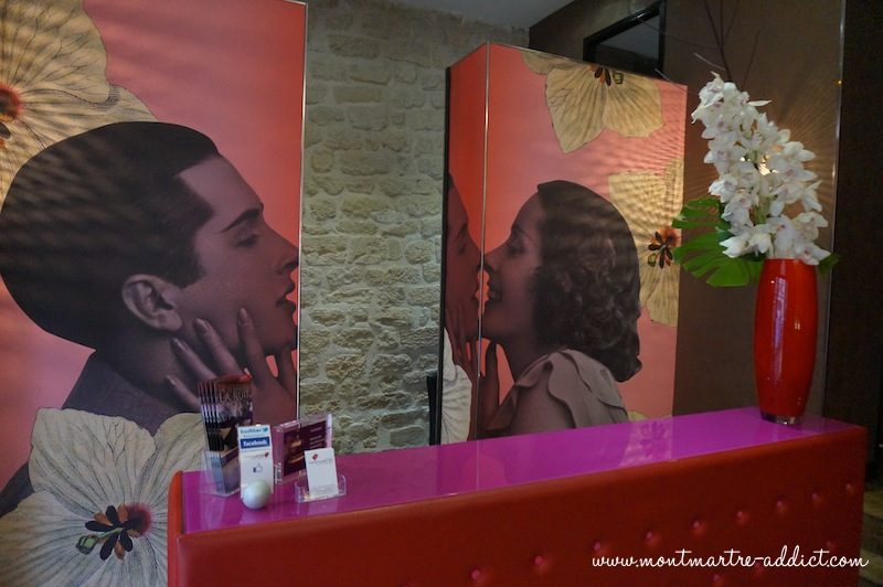 Dès l’entrée, le ton est donné, et deux amoureux dont on ne sait pas encore s’ils sont amants nous accueillent. Et plus on avance dans l’hôtel, plus la passion devient intense et s’affiche sur les murs. Ces murs peints, omniprésents, sont d’ailleurs l’une des particularités du lieu, où l’on constate également qu’une attention toute particulière a été portée au choix des matériaux. Ces murs donc, sur lesquels on peut lire les plus belles déclarations d’amour… Ces murs et ces couleurs, parmi lesquelles le rouge passion « Montmartre Mon Amour » créé en exclusivité pour l’hôtel ; aucun détail n’a été négligé.