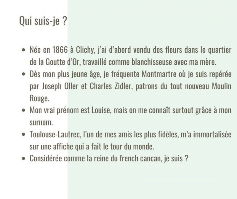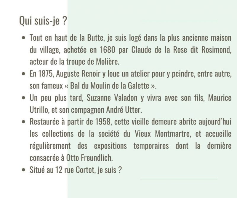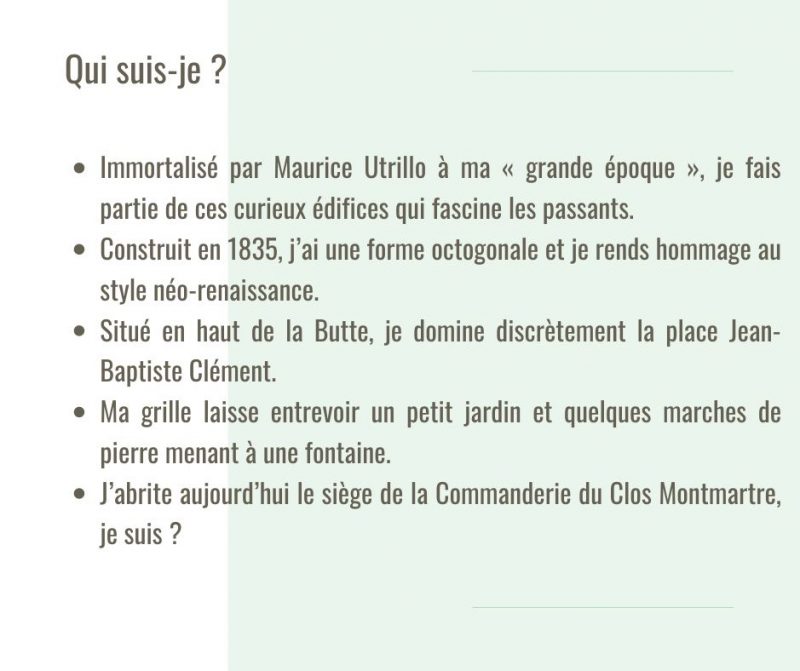 Que vous habitiez Montmartre ou pas, vous pensez bien connaître le quartier ? C’est le moment de tester vos connaissances. Tous les jours sur notre compte Instagram, nous défions notre communauté au travers de différents quizz. Mais parce que tout le monde n’est pas sur les réseaux sociaux, voici le premier quizz de la semaine. Vous pouvez vous munir d’un papier et d’un crayon !pour calculer votre score, et voir les résultats en cliquant sur le lien en fin de jeu. Alors, prêt.e.s à relever le défi ??? C’est parti !