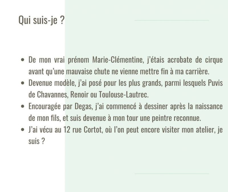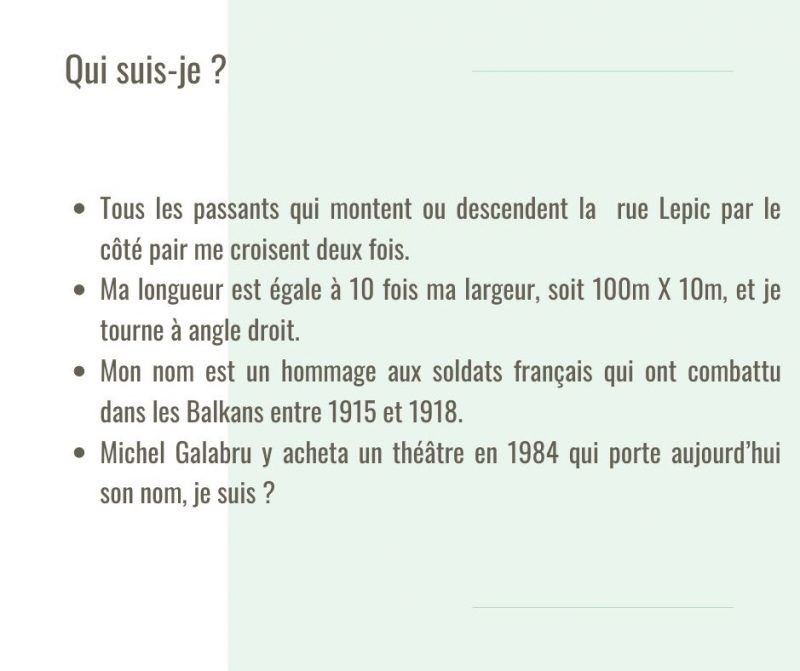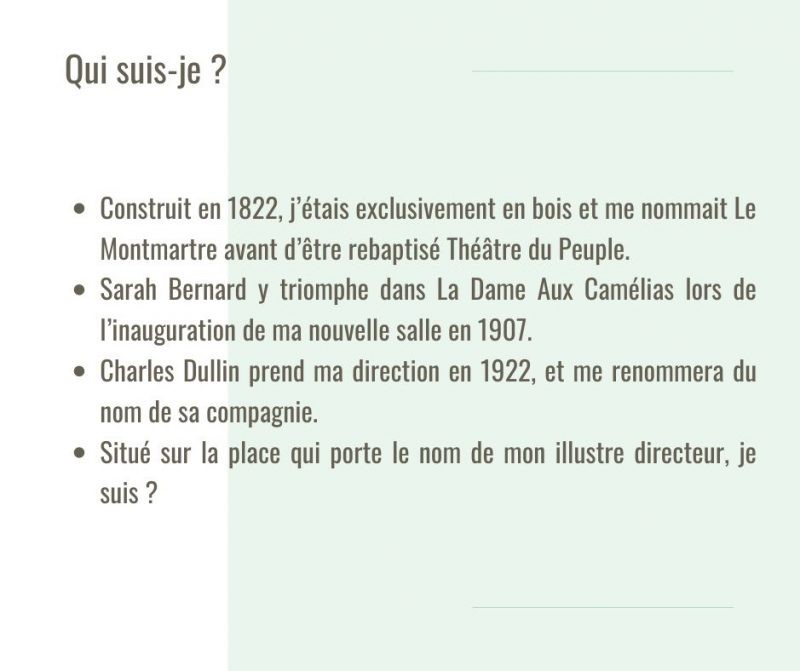 Que vous habitiez Montmartre ou pas, vous pensez bien connaître le quartier ? C’est le moment de tester vos connaissances. Vous pouvez vous munir d’un papier et d’un crayon !pour calculer votre score, et voir les résultats en cliquant sur le lien en fin de jeu. Alors, prêt.e.s à relever le défi ??? C’est parti !