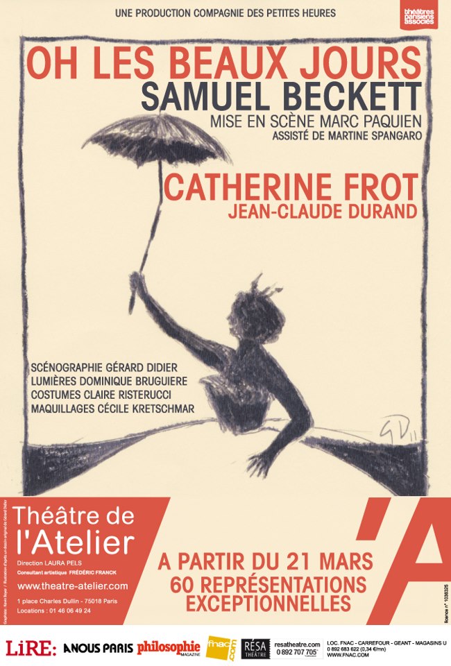 Après le succès remporté au Théâtre de la Madeleine en 2012, Catherine Frot reprend en ce moment le rôle de Winnie dans « Oh les beaux jours » de Samuel Beckett au Théâtre de l’Atelier. Ce sont donc 60 représentations exceptionnelles qui auront lieu jusqu’au 1er juin dans l’un des plus beaux théâtre de la Butte.