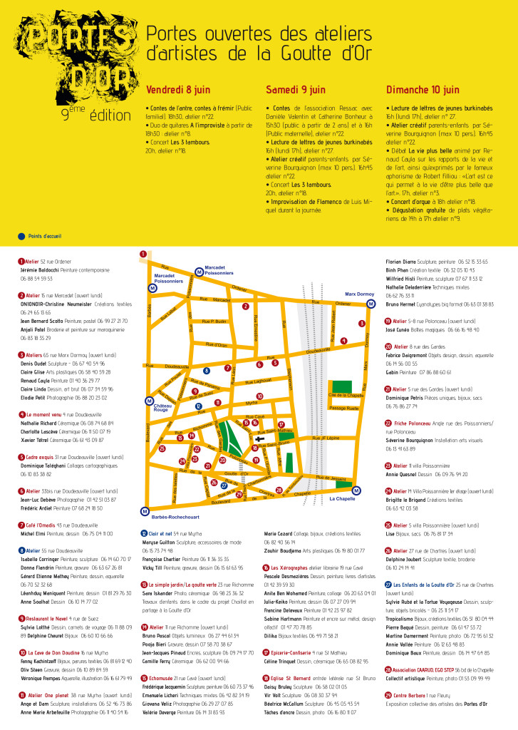 Du 8 au 11 juin, les ateliers d’artistes de la Goutte d’Or ouvriront leurs portes, permettant au public de découvrir le travail de plus de 70 artistes dans divers lieux du quartier.