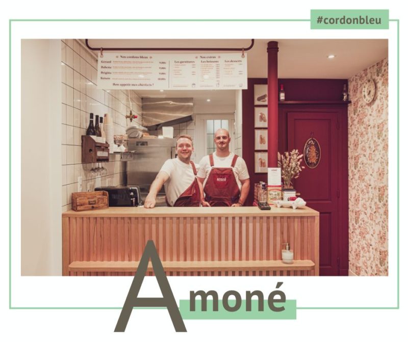 En voilà deux qui n’ont pas attendu pour faire parler d’eux quand on voit la queue qui s’allonge de jour en jour devant leur resto au format de poche rue Chappe. Il faut dire qu’Amoné, c’est un lieu délicieusement régressif, qui nous replonge direct en enfance. C’est d’ailleurs cette période qui a inspiré Guillaume, l’un des deux associés, quand sa grand-mère lui préparait des cordons bleus avant d’aller au rugby. Après un an et demi de travail acharné pour trouver les bons fournisseurs et tester les recettes, il a ouvert avec Pierre le premier resto parisien entièrement consacré aux cordons bleus. Présentés sous forme de ballotines, les préparations sont gourmandes et généreuses, parfaites quand on s’apprête à arpenter la Butte par exemple. Quelques petites tables permettent aussi de faire une pause sur place. Le fait que plein de voisins reviennent régulièrement depuis l’ouverture est un très bon signe, d’ailleurs on en fait partie.