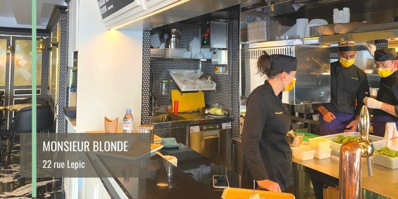 La rue Lepic a toujours été l’une des plus dynamiques du quartier et on adore la voir évoluer au fur et à mesure des années, surtout lorsqu’il s’agit d’un lieu gourmand. La nouveauté à l’angle de la rue Robert Planquette c’est Monsieur Blonde, un corner pas comme les autres qui propose de la street food améliorée : une vente à emporter avec des produits haut de gamme à des prix accessibles. Chaque recette privilégie le bio et le local pour surfer avec goût sur la vague d’un « take-away » plus responsable. Même les packagings en bagasse (matière naturelle issue de la canne à sucre) sont biodégradables. On a testé le burger classique au boeuf Charolais et on a particulièrement apprécié la sauce aigre douce et son délicieux retour salé-pimenté. Mais c’est en repassant quelques jours plus tard qu’on a été complètement subjugués : la saucisse-aligot est à emporter… et on vous met au défi de retrouver ça dans le quartier ! Pour celles et ceux qui préfèrent prendre leur temps, profitez de déjeuner ou diner sur place, la déco est à tomber !