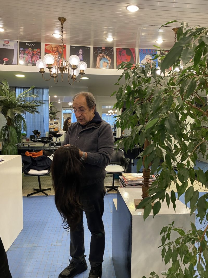 La conversation est lancée, et quand il s’agit de parler cheveux et coiffure, notre homme est intarissable ! Il faut dire qu’avec 60 ans de métier au compteur, il a de quoi raconter. Raphaël n’a même pas 15 ans quand il démarre son apprentissage, à l’époque dans la seule école de coiffure d’état où il enseignera d’ailleurs quelques années plus tard. Diplômes en poche, il commence à exercer dans différents salons, et travaille durant deux ans en tant que coiffeur chez un perruquier, où il réalise pas moins de 126 perruques pour la revue de Zizi Jeanmaire et Roland Petit au Casino de Paris. Est-ce que parce qu’un certain Yves Saint-Laurent, créateur des costumes, lui glisse un jour au sujet de son travail « c’est divin » ? Toujours est-il qu’il se découvre une véritable passion pour l’exercice ; il n’a que 24 ans. Un plus tard, en septembre 73, il ouvre son propre salon de coiffure à Pigalle. « Quand j’ai acheté, c’était déjà un salon de coiffure, et il y avait une dizaine de casques séchants en plein milieu ». Cinquante ans plus tard, Raphaël est toujours là, et les casques séchants aussi !